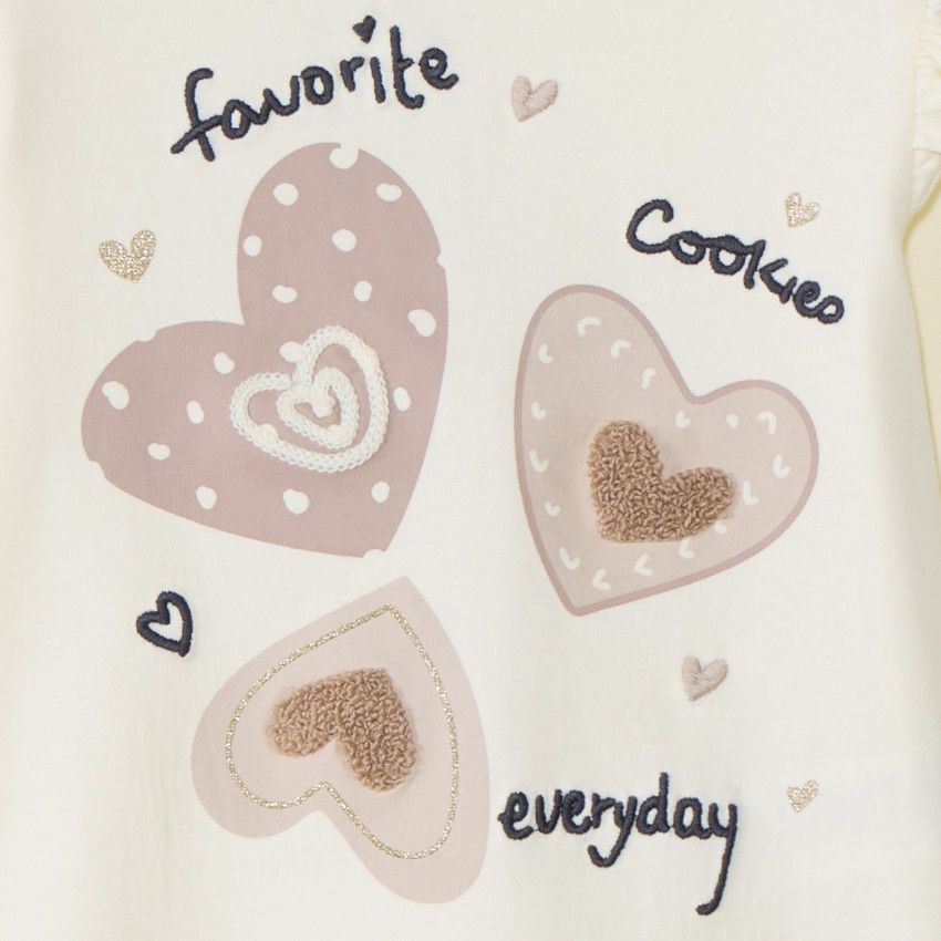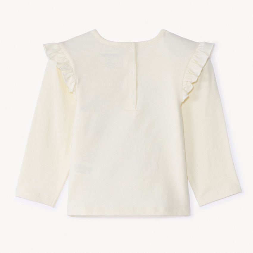На передней части расположено милое изображение зайца, которое придаёт образу очаровательный акцент. Оборки на плечах добавляют модели нежности и делают дизайн более выразительным. Застёжки на спине облегчают надевание и переодевание ребёнка. Длинные рукава делают футболку практичной для прохладной погоды.