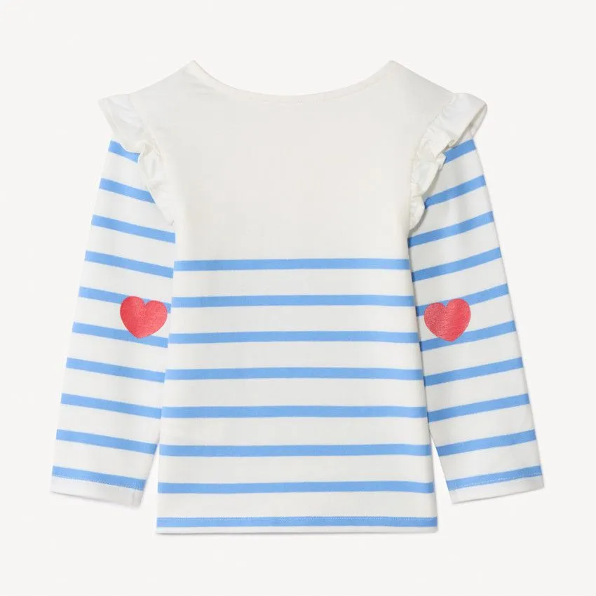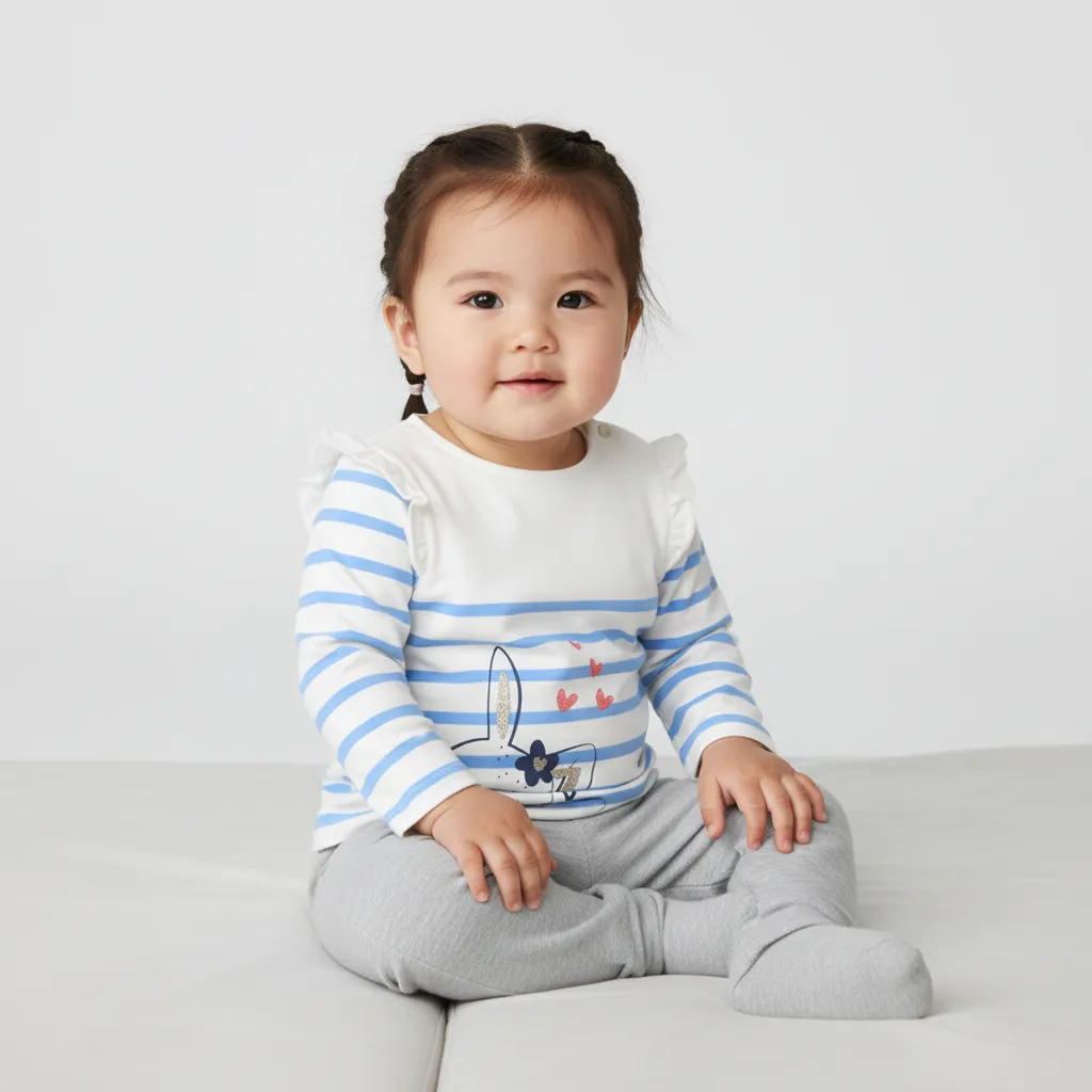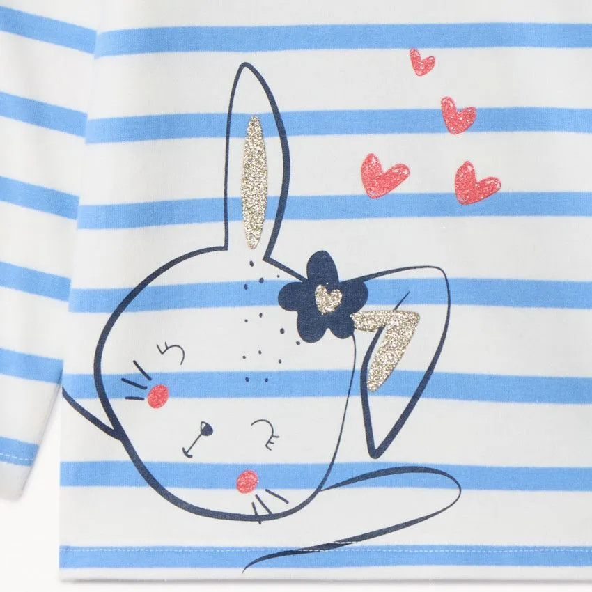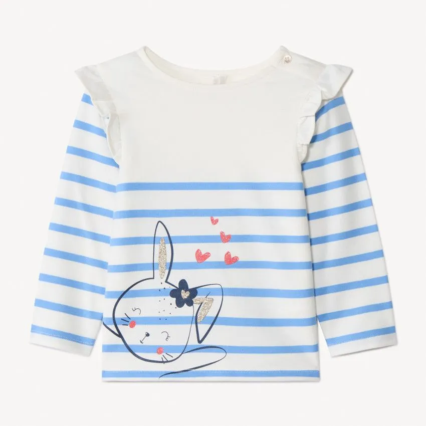 На передней части расположено милое изображение зайца, которое придаёт образу очаровательный акцент. Рюши на плече добавляют модели нежности и декоративности. Застёжка на пуговицу на плече облегчает процесс надевания и переодевания ребёнка. Длинные рукава делают футболку практичной для прохладной погоды.