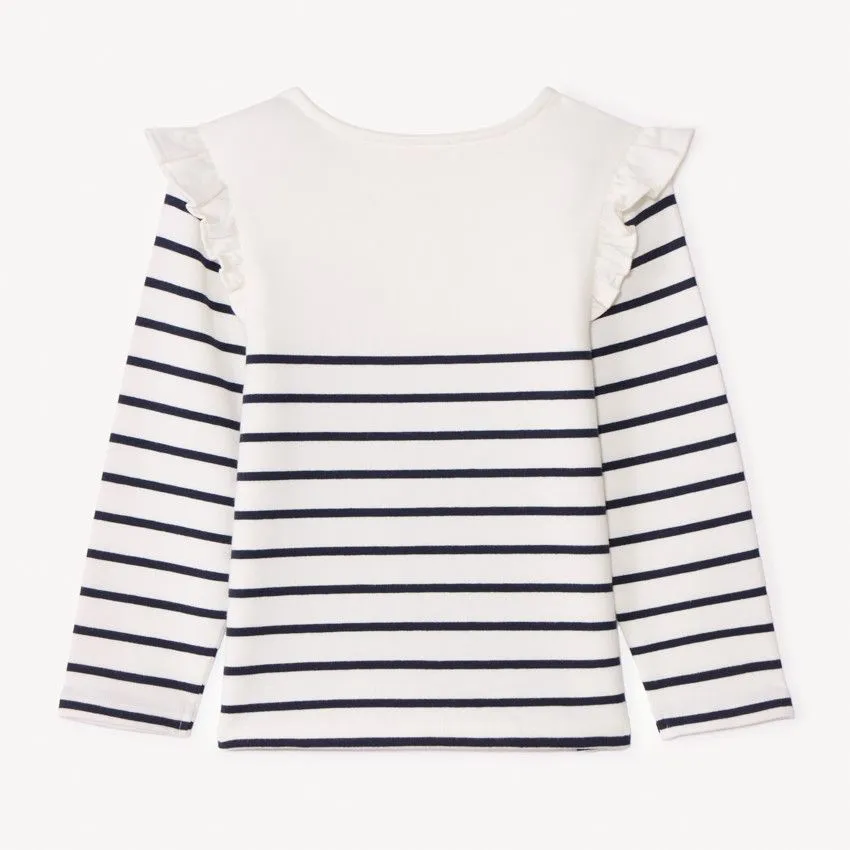 Оборки на плечах добавляют модели нежности и декоративности, делая образ более выразительным. Застёжка на пуговицу на плече облегчает надевание и переодевание ребёнка. Длинные рукава повышают практичность и комфорт в прохладную погоду.