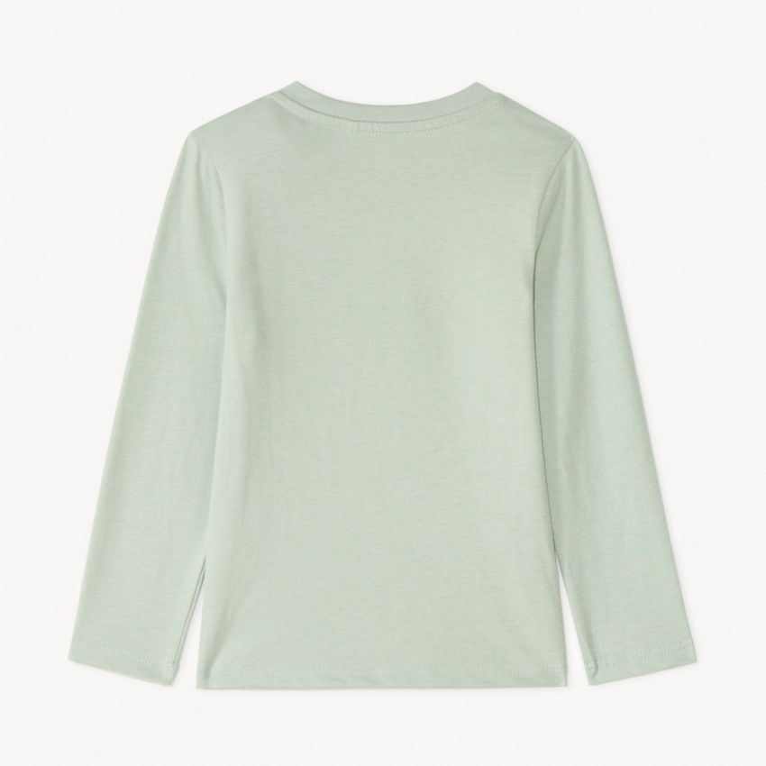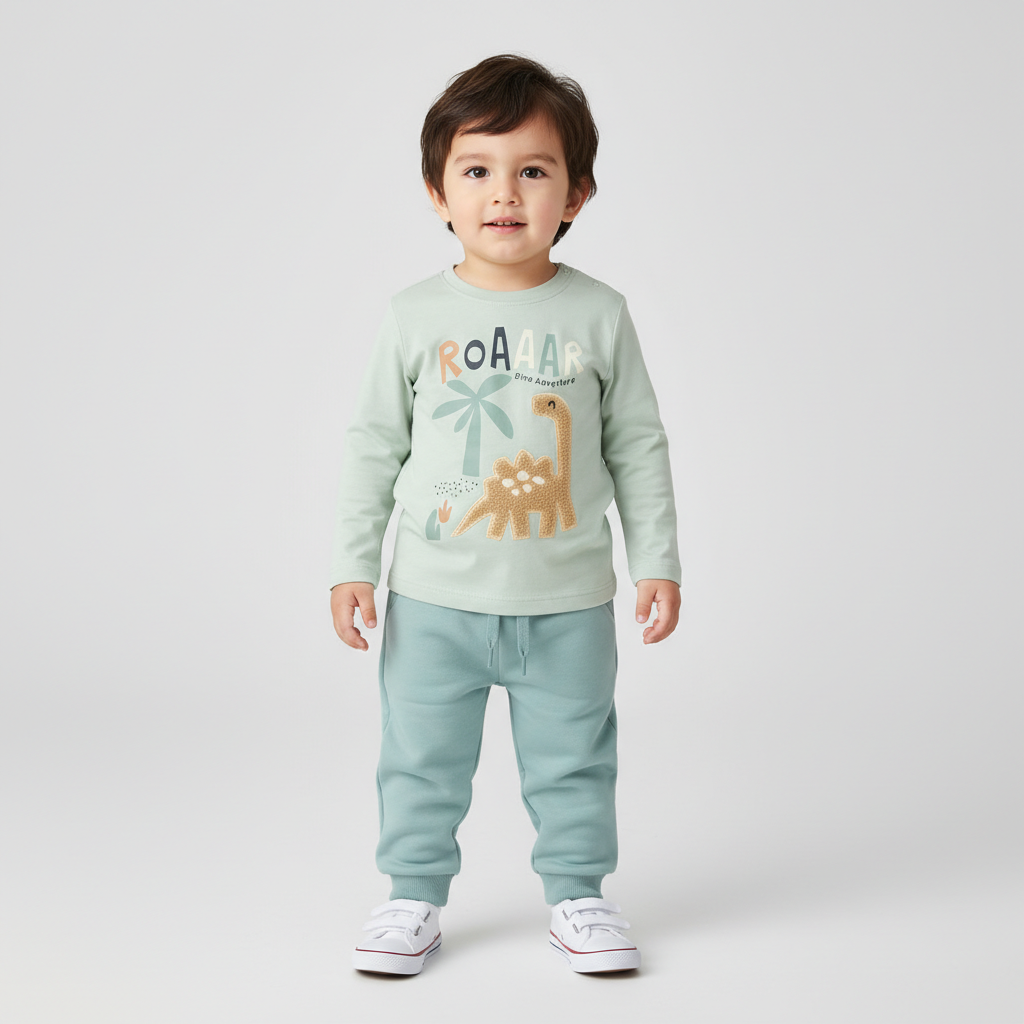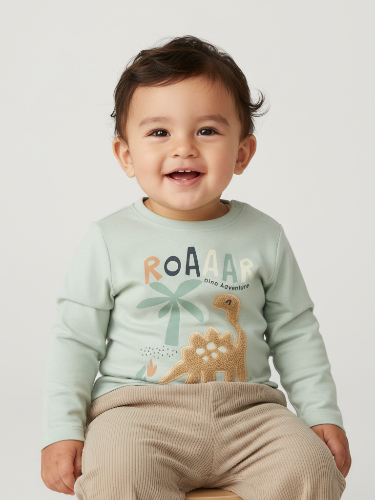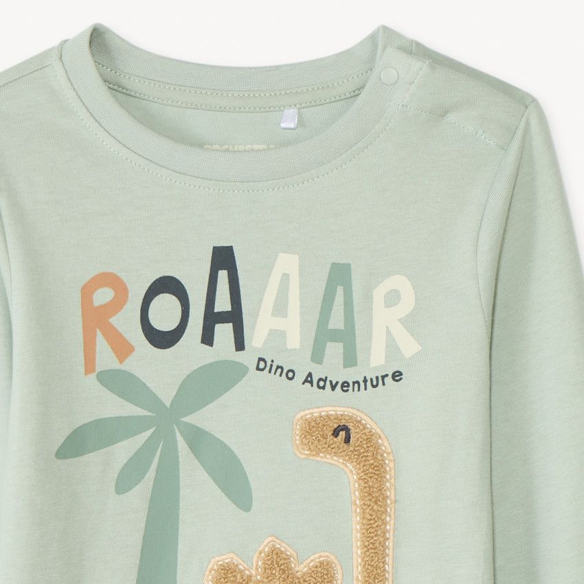 Круглый вырез и удобная застёжка на кнопках в верхней части плеча позволяют быстро и легко переодеть ребёнка. Футболка декорирована оригинальной нашивкой с динозавром и принтом спереди.