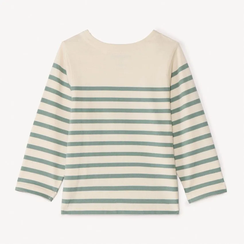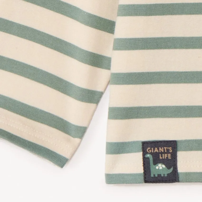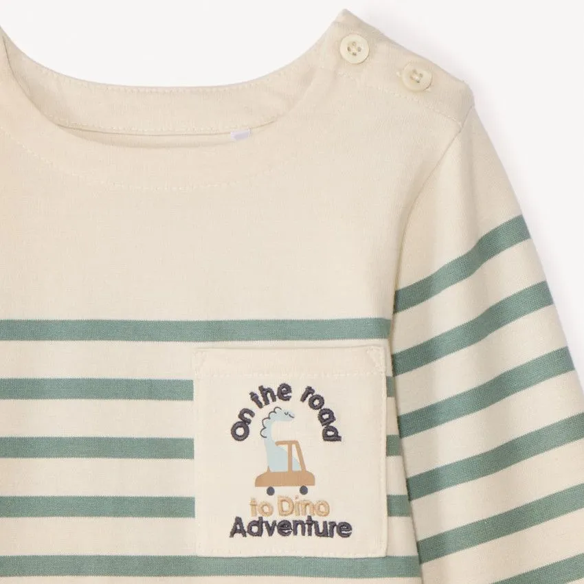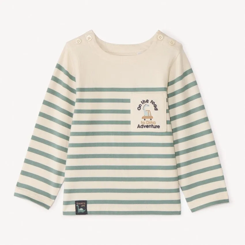 Застёжка на пуговицы на плече облегчает процесс надевания, а комфортный крой не сковывает движений. Декоративный нагрудный карман с принтом и классический полосатый дизайн делают модель стильной и универсальной.