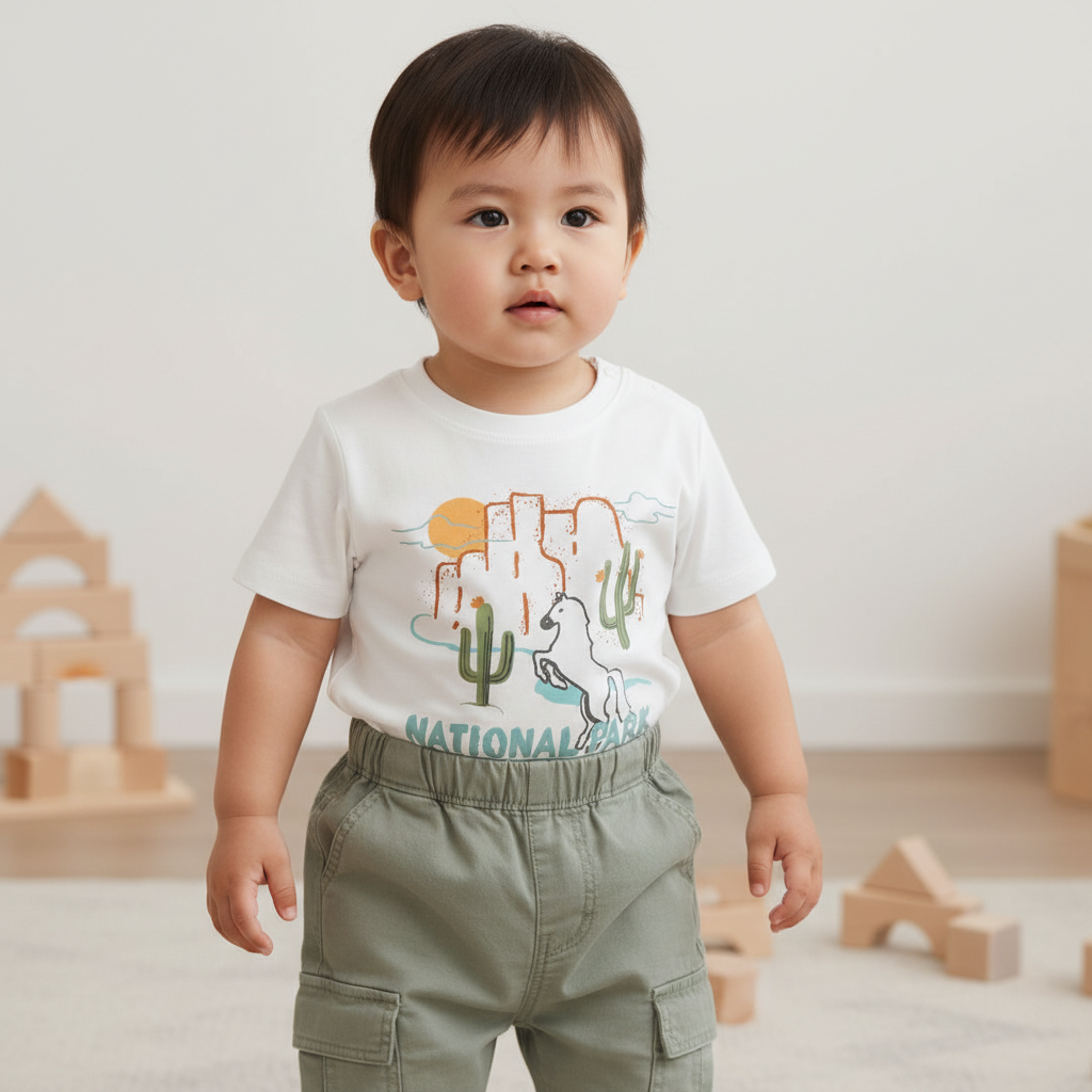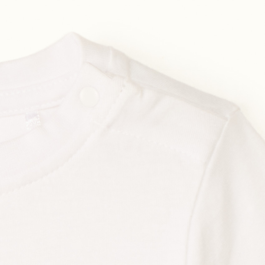 Застёжка на кнопке на плече облегчает процесс надевания и снятия, что особенно удобно для малышей. Футболка подойдёт для дома, прогулок и повседневной носки.