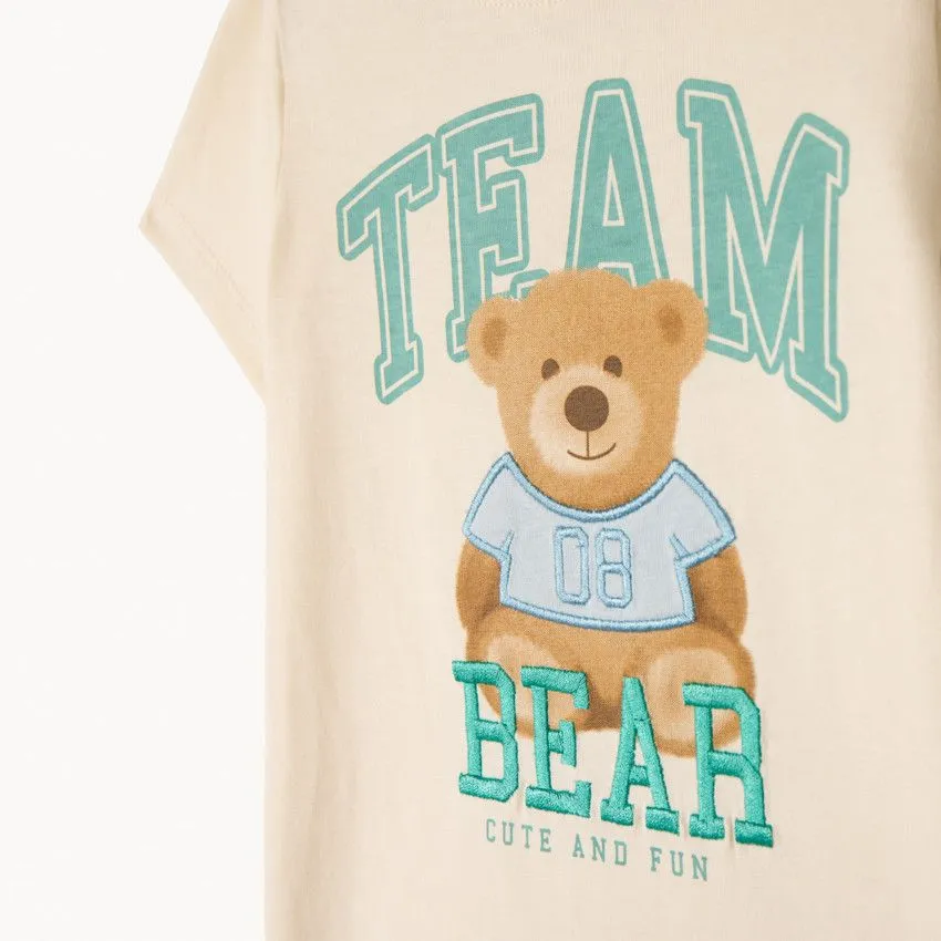 На передней части расположено изображение плюшевого мишки, выполненное в сочетании принта и вышивки, что придаёт футболке аккуратный декоративный акцент и делает образ особенно уютным. Отлично подойдёт для дома, прогулок и детского сада.