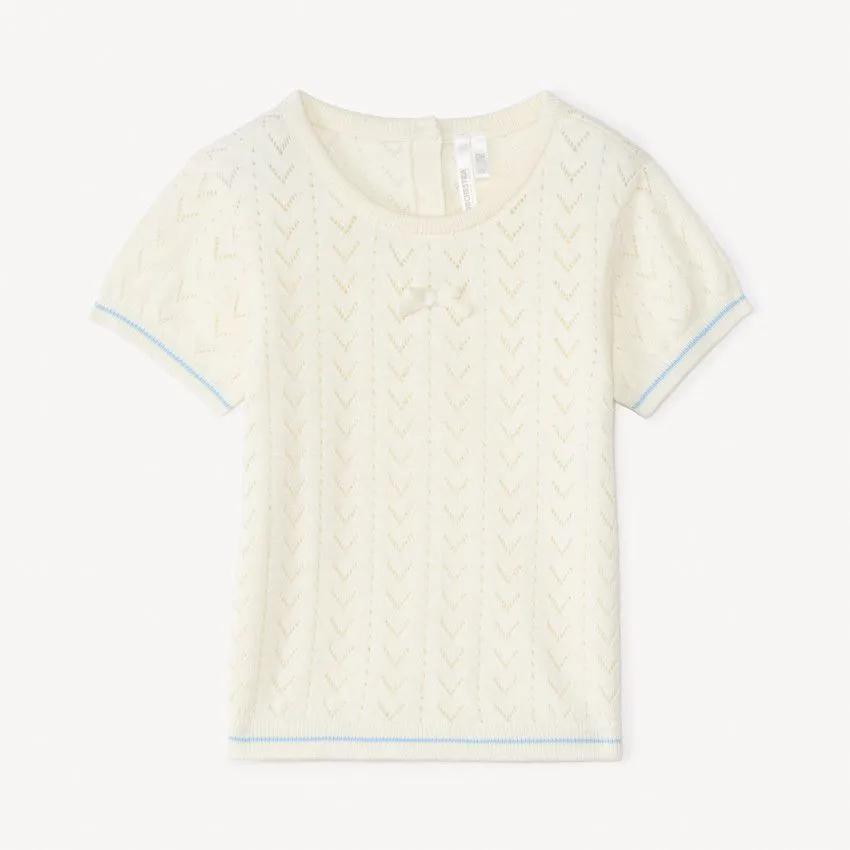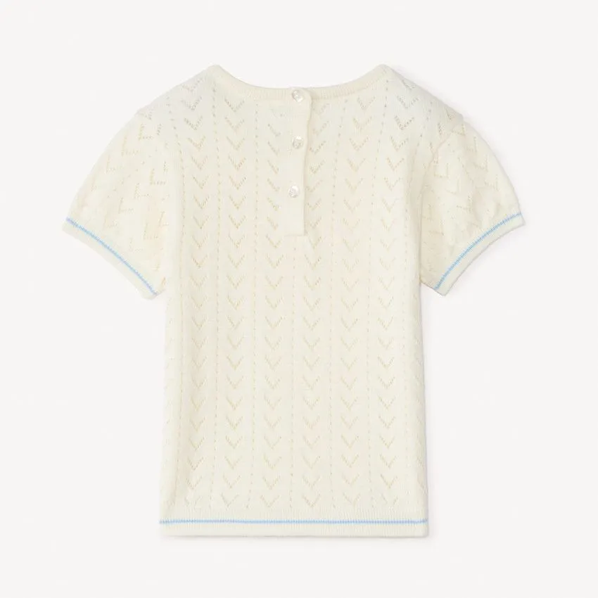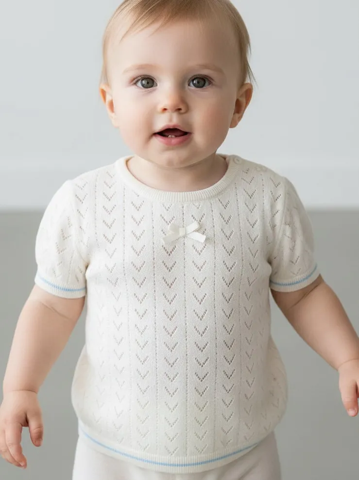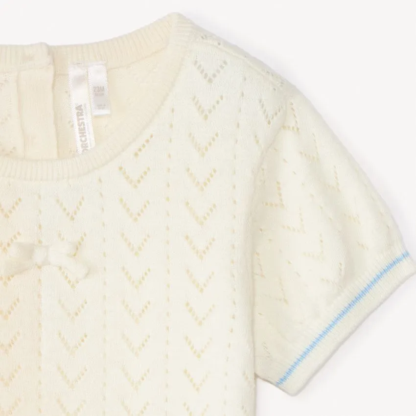 Вязаная футболка с коротким рукавом для малышки от Orchestra выполнена из 100% хлопка, мягкого и приятного к нежной коже ребёнка. Ажурная вязка придаёт модели лёгкость и аккуратный нарядный вид, а застёжка на пуговицы сзади обеспечивает удобство при надевании. Отличный вариант для комфортных прогулок и повседневных образов.
