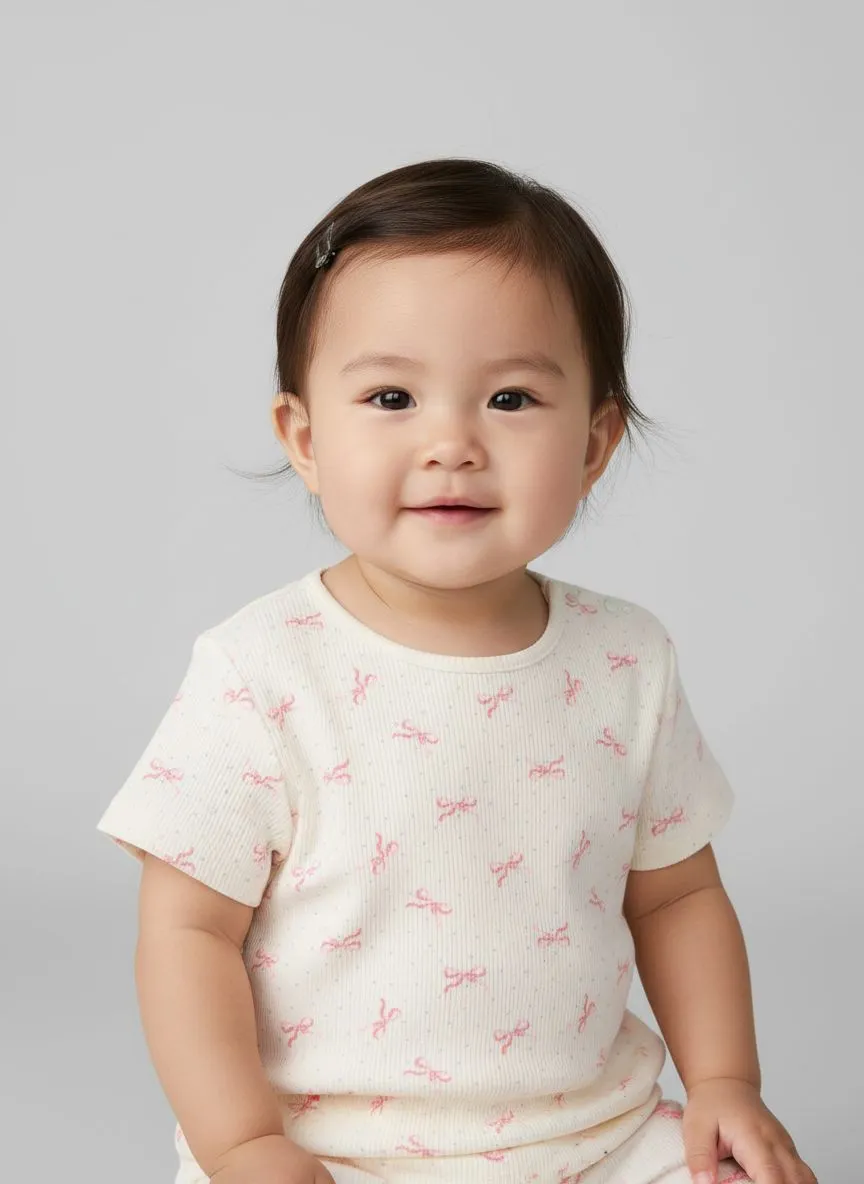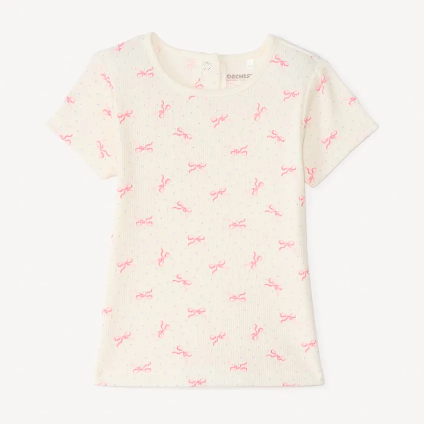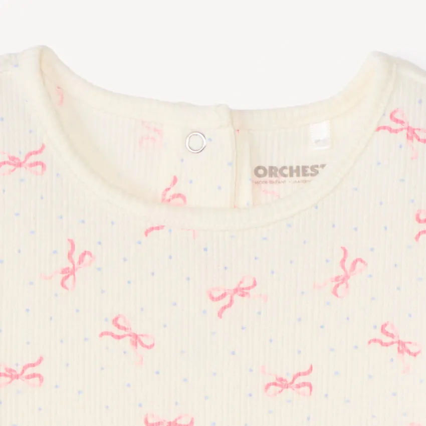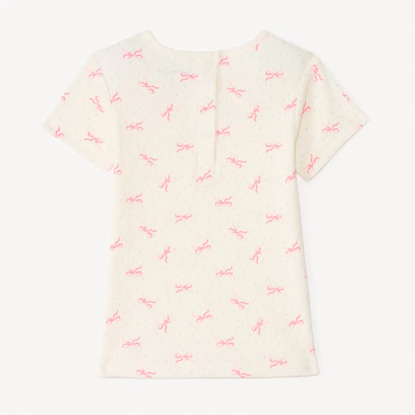 Нежная футболка из мягкого ребристого трикотажа станет удобным и стильным вариантом на каждый день. Светлый оттенок и милый принт с бантиками и крапинками по всей ткани придают модели аккуратный и очаровательный вид. Круглый вырез из эластичной резинки хорошо держит форму, а застёжка на кнопках в верхней части спинки помогает легко надевать и снимать футболку. Мягкий материал приятен к телу и обеспечивает комфорт в течение всего дня. |