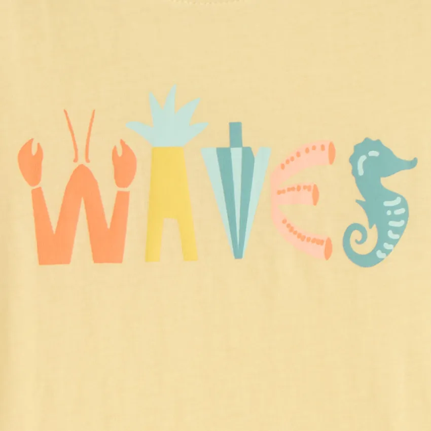 Спереди расположен красочный принт с надписью “Waves”, где буквы дополнены морскими элементами — крабом, ананасом и морским коньком, создавая яркое летнее настроение.