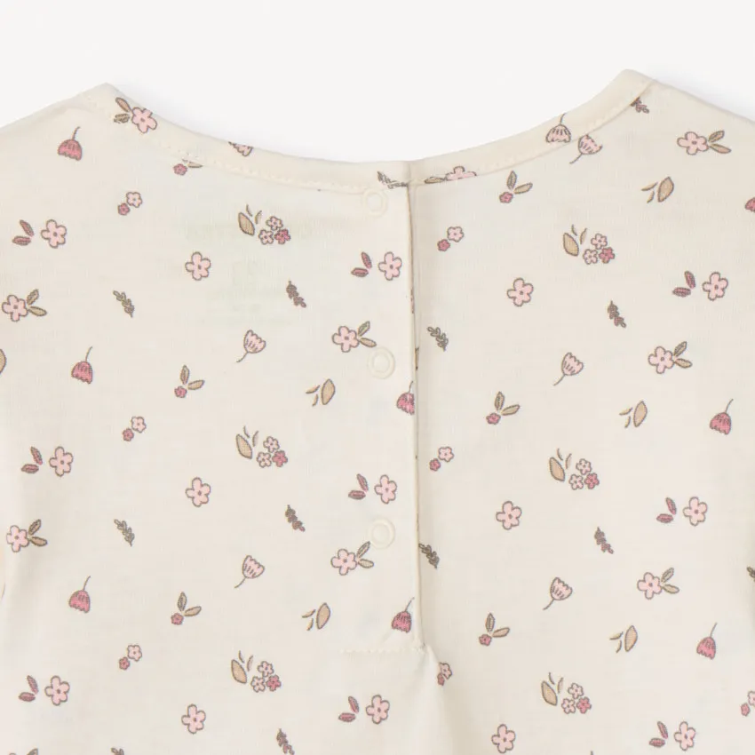 Набор из двух футболок с длинными рукавами из мягкого трикотажа. Круглый вырез, застёжка на кнопки в верхней части спинки. Модели разного дизайна: одна с принтом по всей поверхности, другая однотонная с блестящим принтом в виде сердечка спереди.