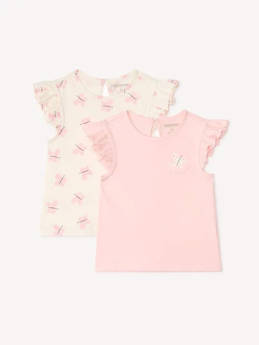 Комплект бренда Orchestra из двух футболок с коротким рукавом для малышки — удобный и стильный вариант для повседневных образов. Футболки выполнены из 100% хлопка, благодаря чему ткань мягкая, дышащая и приятная к телу. Модели представлены в разных цветах и украшены оборками на плечах, которые придают образу нежный и аккуратный вид. Для удобства переодевания предусмотрена застёжка на пуговицу в форме капли в верхней части спины.