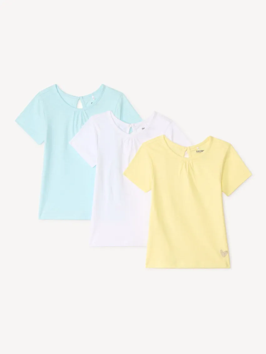Набор из 3 футболок с коротким рукавом для малышки от Orchestra — удобный и нежный вариант для повседневного гардероба. Модели выполнены из мягкого 100% хлопка, который хорошо пропускает воздух и обеспечивает комфорт в течение всего дня. Сзади предусмотрена удобная застёжка-капелька на пуговице, благодаря которой футболку легко надевать и снимать. В нижнем углу каждой модели расположено аккуратное блестящее изображение сердечка, придающее футболкам милый и нежный акцент. Практичный комплект для прогулок, дома и первых активных игр малыша.
