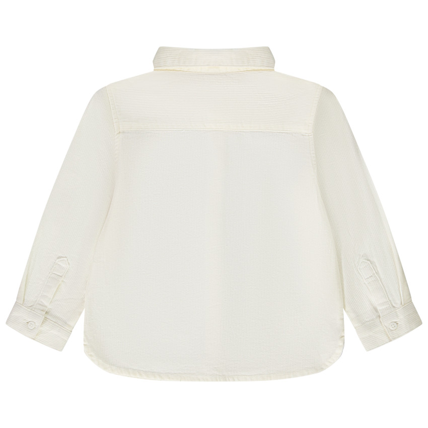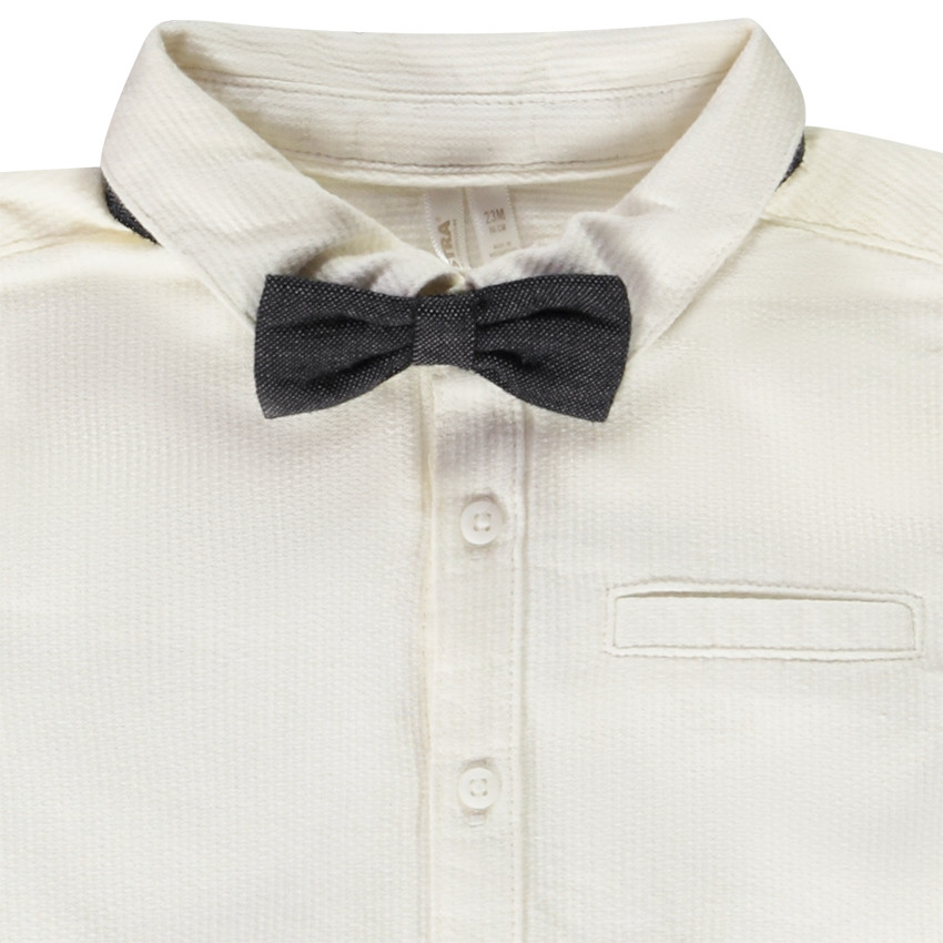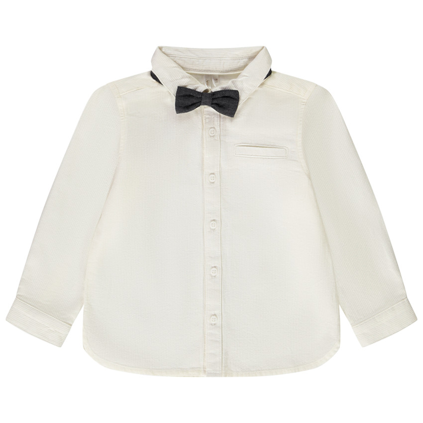 Рубашка из плотного хлопка с воротником-стойкой. Широкие рукава с разрезами спереди, застёжка на пуговицы. Карман с кантом, закруглённый низ. Съёмный контрастный бантик на липучке.