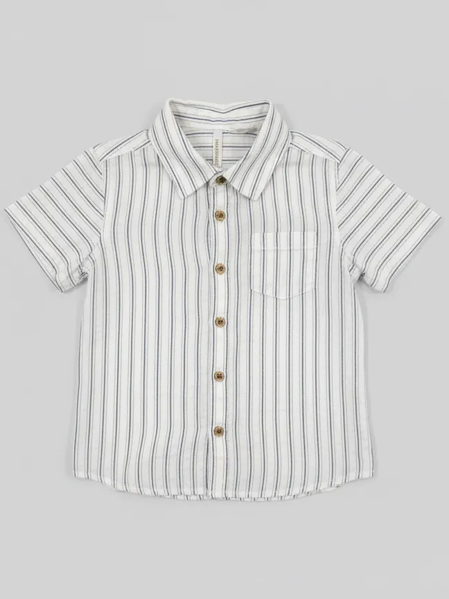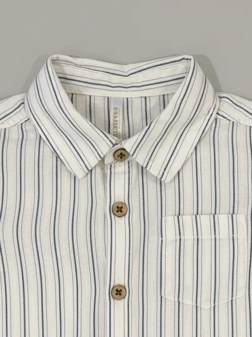 Классическая застёжка на пуговицах позволяет легко надевать и снимать рубашку. Дизайн дополняет один нагрудный карман сбоку, который придаёт модели аккуратный и стильный вид. Лёгкий полосатый принт делает рубашку универсальной — она отлично сочетается как с брюками, так и с джинсами или шортами.