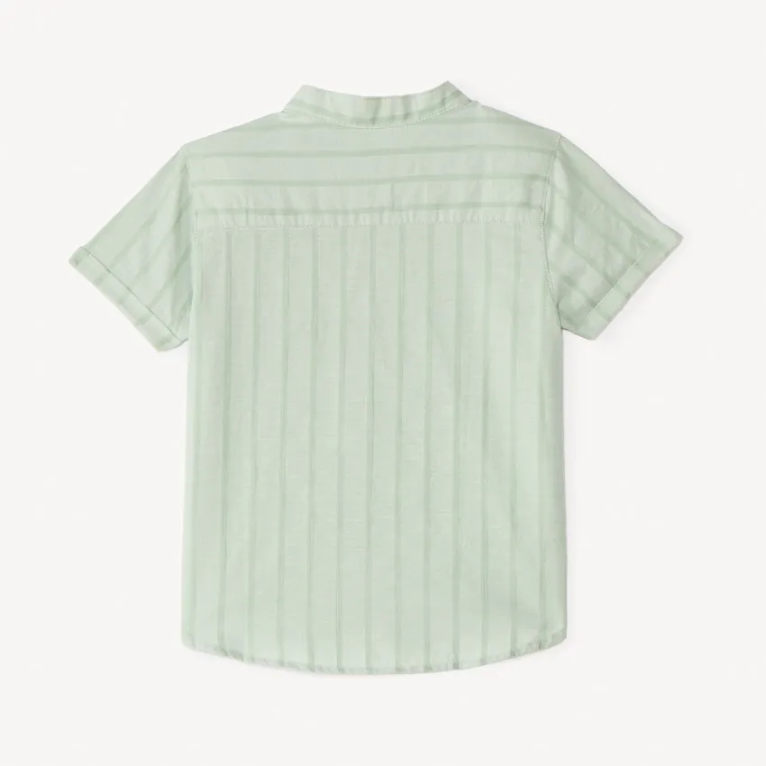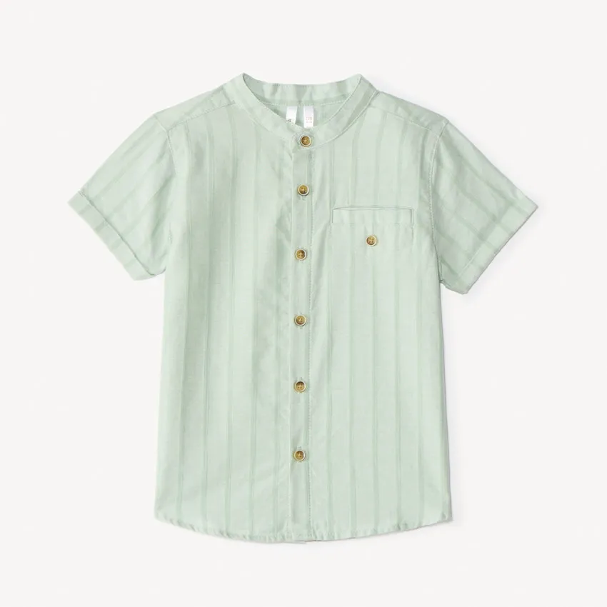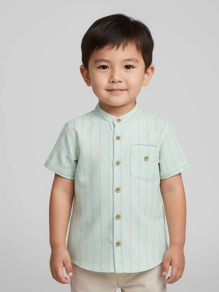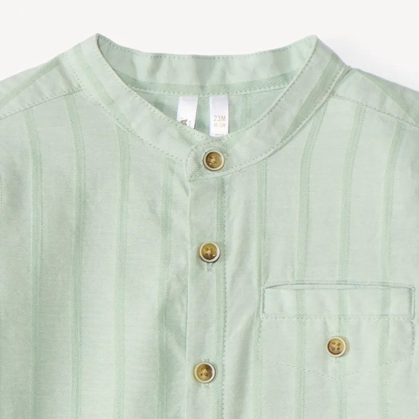 Лёгкая рубашка для малыша выполнена из мягкой ткани в нежном зелёном цвете. Материал хорошо пропускает воздух и обеспечивает комфорт в течение всего дня, что делает модель отличным вариантом для тёплой погоды.