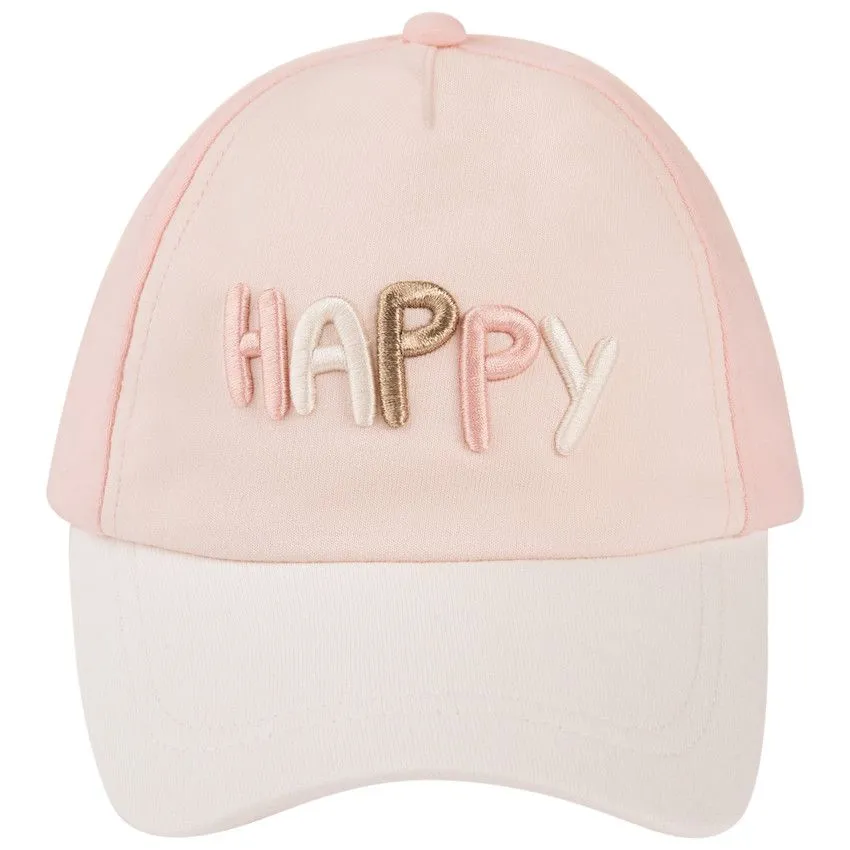 Кепка для малышки розового цвета — яркий и стильный аксессуар, который добавит уюта и оригинальности любому образу. Спереди расположена объемная вышивка с надписью «Happy», выполненная с золотым люрексом, что придает кепке особый блеск и шарм.