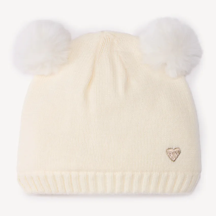 Вязаная шапка с мягкой флисовой подкладкой. Выполнена в однотонном цвете, по бокам украшена пушистыми помпонами из искусственного меха. Внизу — вышитое сердечко из золотистого люрекса и удобный край в рубчик.