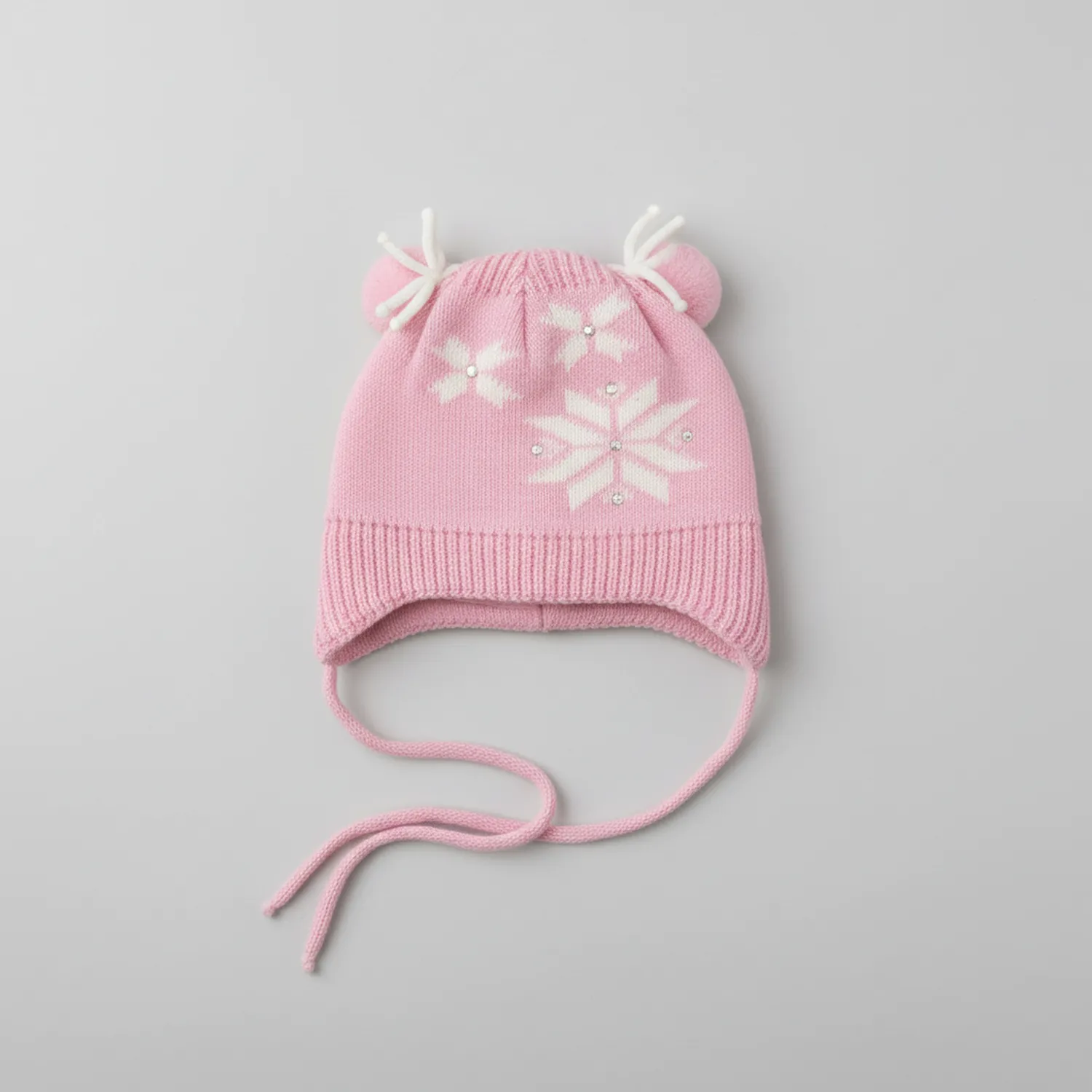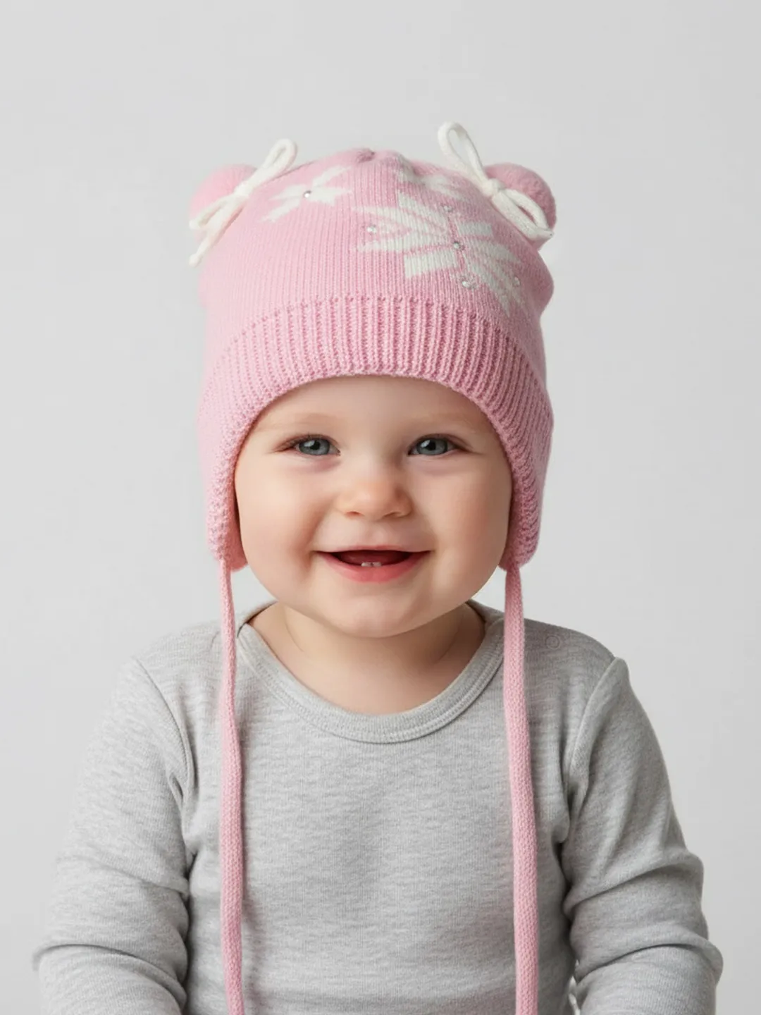 Шапка оснащена завязками для надёжной фиксации, закрывает ушки и идеально подходит для зимних прогулок. Милый дизайн с ушками добавит образу очарования.