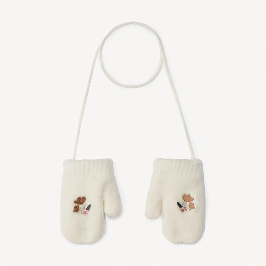 Модель выполнена из приятного на ощупь трикотажа, который бережно согревает руки ребёнка. Украшены нежной вышивкой с цветочным мотивом, добавляющей изделиям особый уют и стиль. Длинная шнуровка предотвращает потерю варежек и обеспечивает удобство в повседневном использовании.