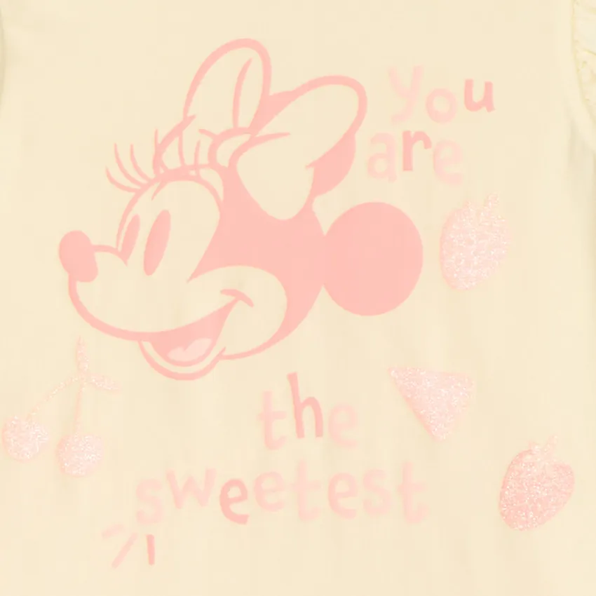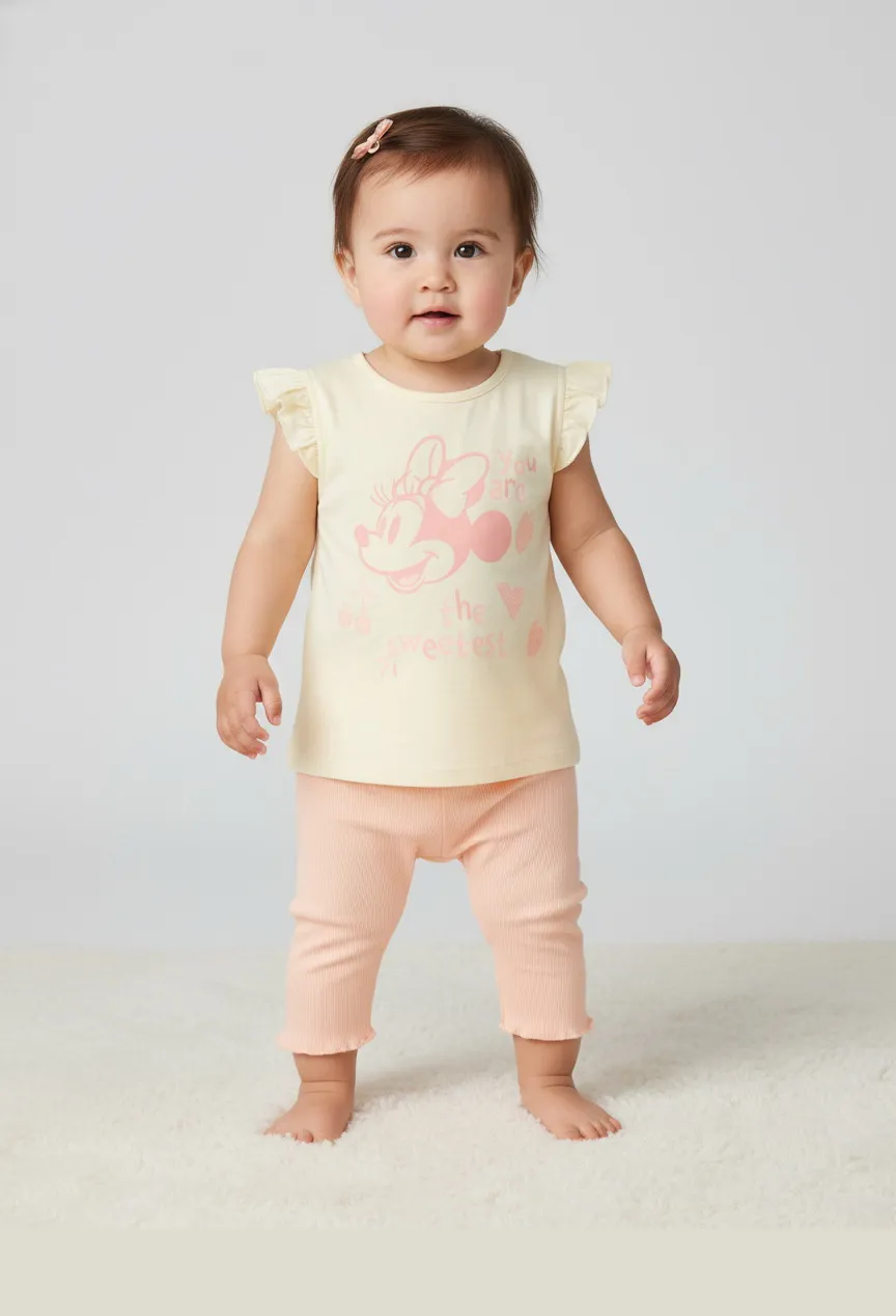 Комплект футболка б/р + шорты (велосипедки) Orchestra для малышки — удобный и стильный вариант для тёплой погоды. Футболка без рукавов украшена принтом Минни Маус по центру, а рукава с оборками придают образу нежность и игривость. Застёжка на кнопках в верхней части спины облегчает переодевание ребёнка. Велосипедки имеют эластичный пояс на резинке, который обеспечивает комфортную посадку и свободу движений. Состав: 95% хлопок / 5% эластан — мягкая, дышащая и эластичная ткань, приятная к коже ребёнка и удобная для активных прогулок.