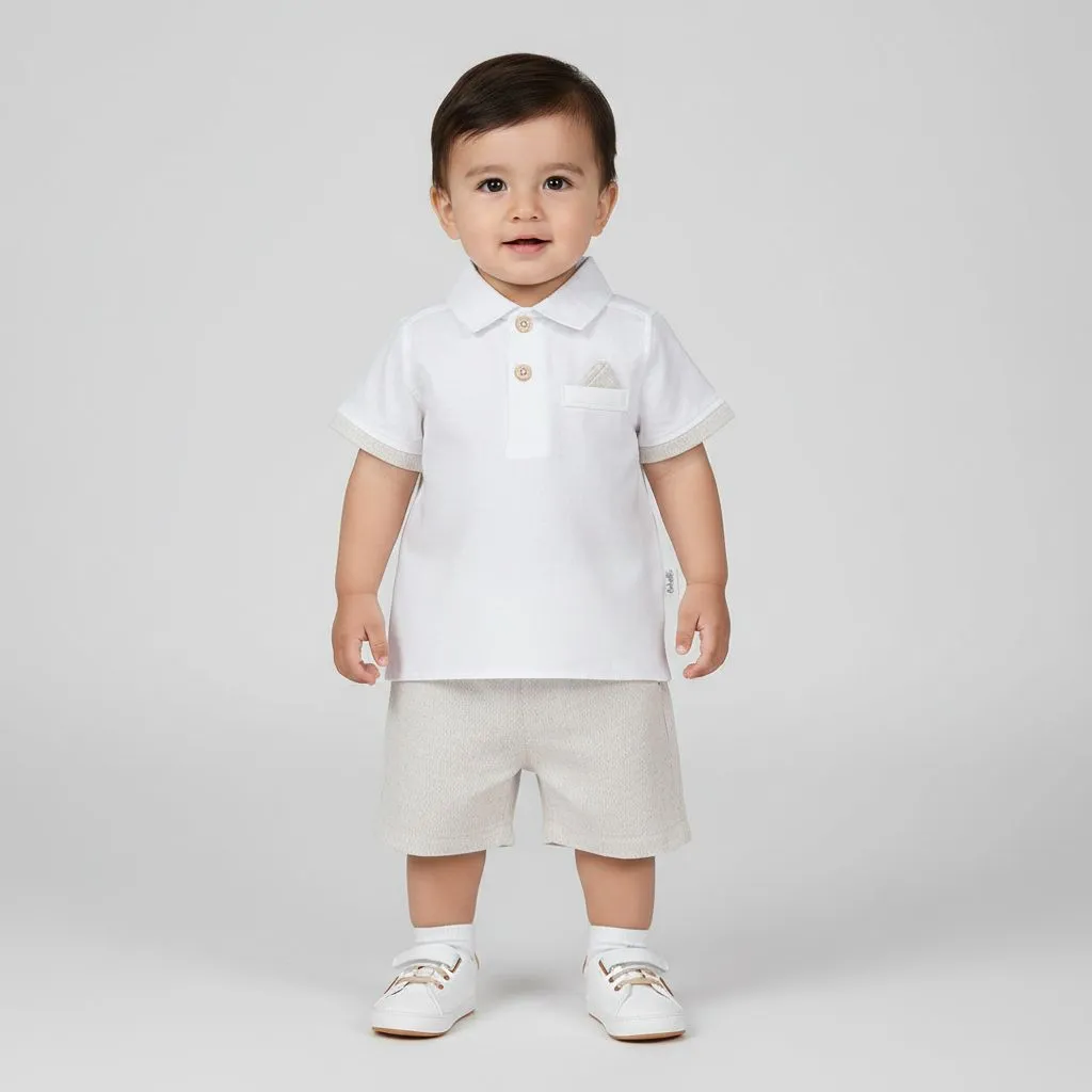 Набор из 2-х вещей для малыша (поло и шорты) — стильный и комфортный комплект для тёплых дней, прогулок и особых случаев. Поло выполнено из 100% хлопка — мягкого, дышащего и приятного к коже материала. Классический воротник и аккуратная планка с пуговицами придают модели аккуратный и нарядный вид, а короткие рукава обеспечивают комфорт в жаркую погоду. Небольшой нагрудный карман с декоративным платочком добавляет образу изящный акцент. Шорты изготовлены из ткани с составом 50% хлопок, 25% лён, 25% вискоза. Материал лёгкий, хорошо пропускает воздух и комфортен при носке. Свободный крой не сковывает движений, а мягкая текстура ткани делает шорты удобными для активных игр и прогулок. |