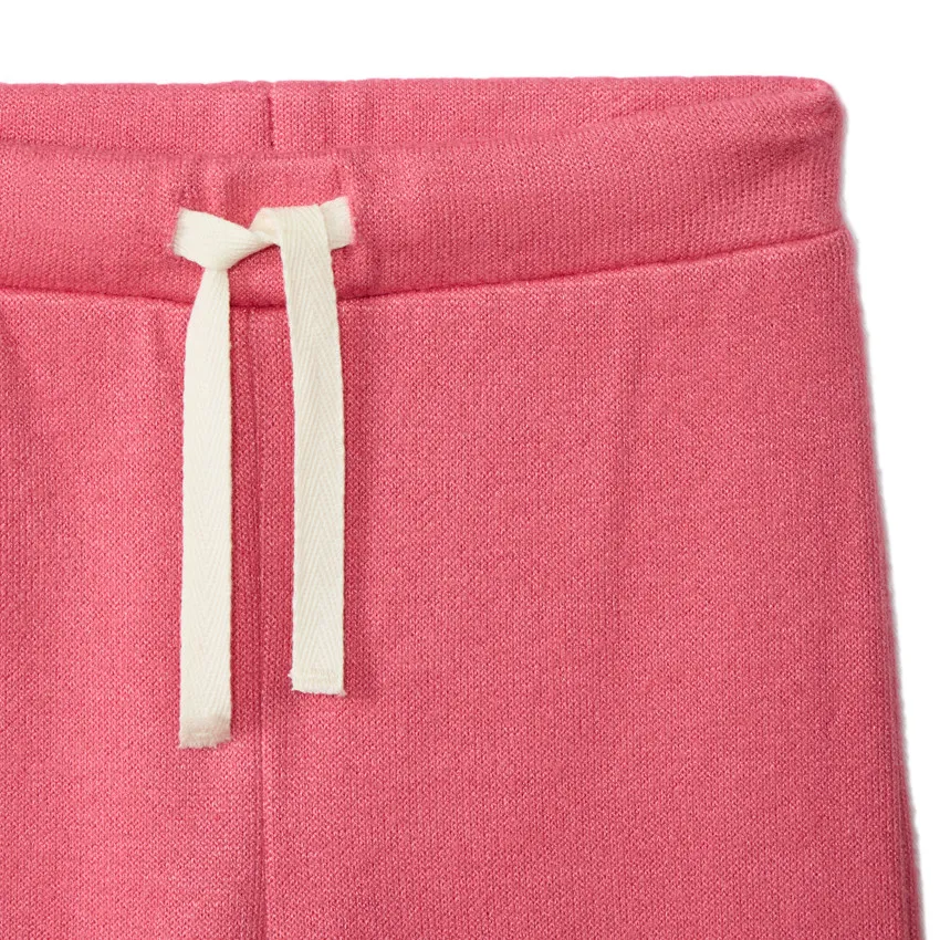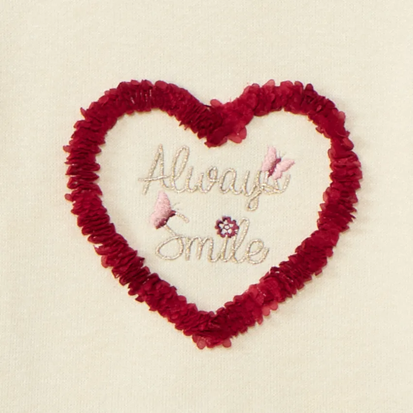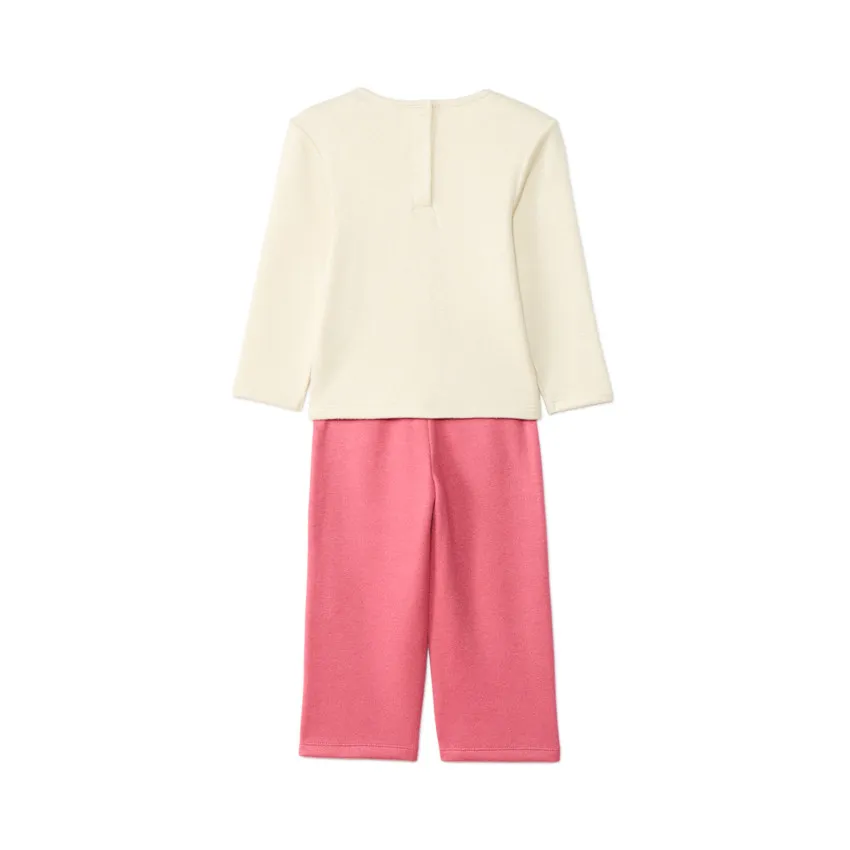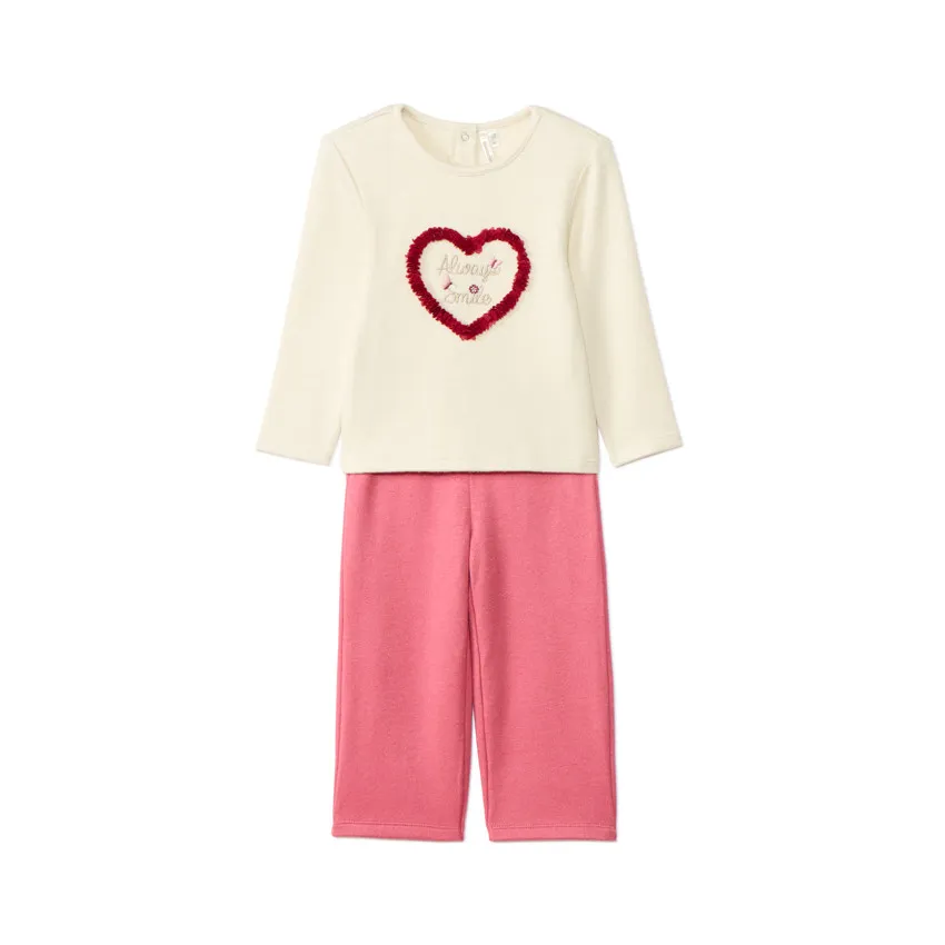 Детский комплект из двух предметов, выполненный в технике «cut & sew». Футболка с длинным рукавом кремового цвета имеет круглый вырез горловины, застёжку на спинке и украшена объёмным сердцем с лепестковым эффектом и золотистой люрексовой вышивкой спереди. Спинка однотонная. Брюки розового цвета с широкими штанинами дополнены эластичным поясом и контрастным регулируемым шнурком для комфортной посадки.