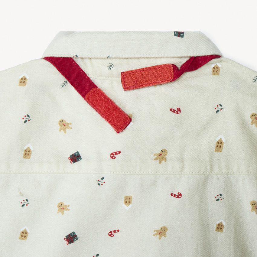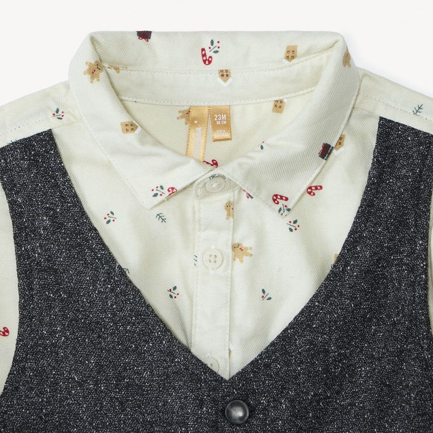 Рубашка выполнена из мягкого 100% хлопка и имеет дизайн 2 в 1: в неё встроена обманка в виде жакета, создающая эффект многослойности без лишнего объёма. В комплект также входит галстук, гармонично дополняющий образ.