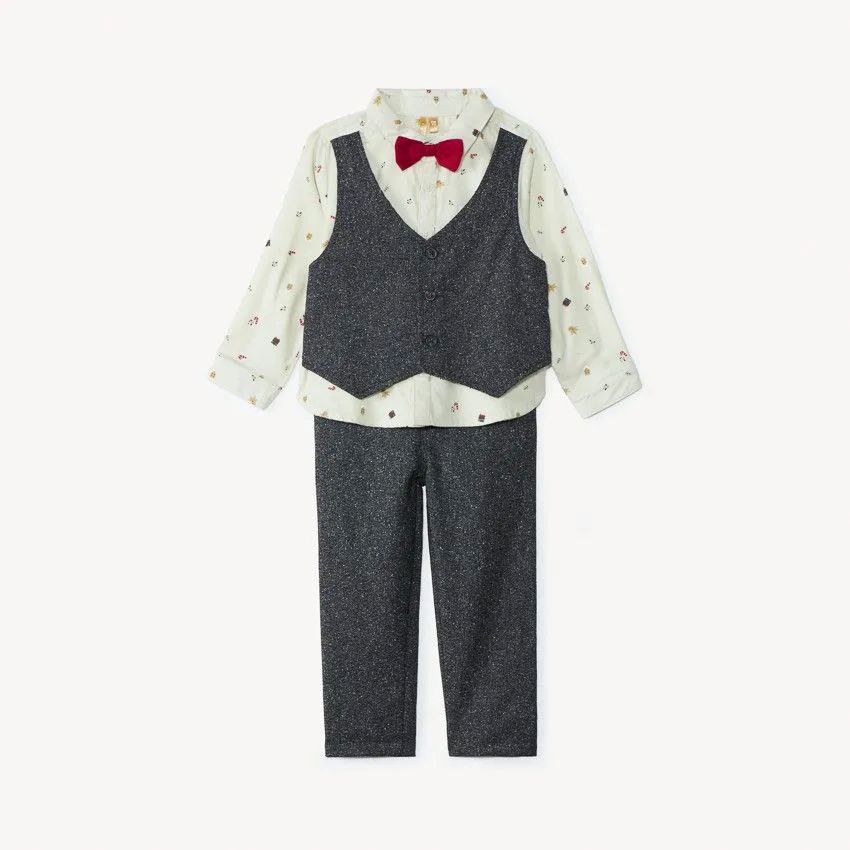 Рубашка выполнена из мягкого 100% хлопка и имеет дизайн 2 в 1: в неё встроена обманка в виде жакета, создающая эффект многослойности без лишнего объёма. В комплект также входит галстук, гармонично дополняющий образ.