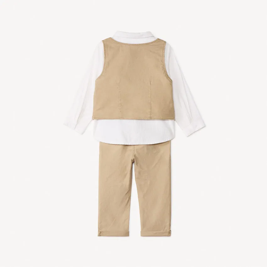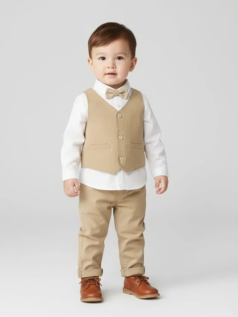 Нарядный комплект для мальчика из 3 предметов — стильный вариант для праздников, фотосессий и особых случаев. Элегантный дизайн делает образ аккуратным и праздничным. В комплект входит жилет без рукавов с V-образным вырезом и застёжкой на пуговицы спереди. Рубашка с длинными рукавами выполнена из лёгкой хлопковой ткани с полосатым эффектом, имеет классический воротник и застёжку на пуговицы. Образ дополняет контрастная бабочка, которая крепится на липучке и легко снимается. Брюки выполнены из лёгкой ткани chambray и имеют регулируемый пояс с внутренними эластичными вставками и пуговицами для удобной посадки. Модель дополнена застёжкой на кнопку, декоративной планкой и аккуратными подворотами внизу брючин. |