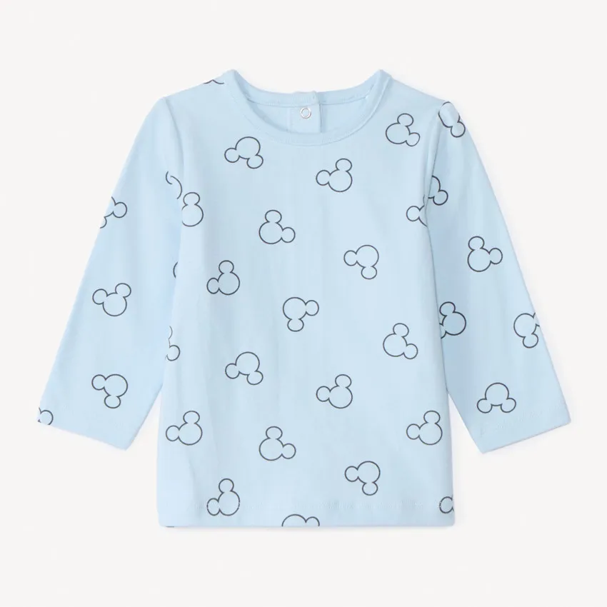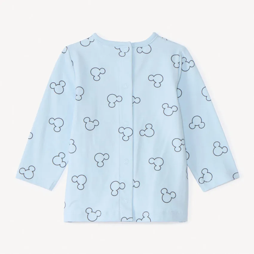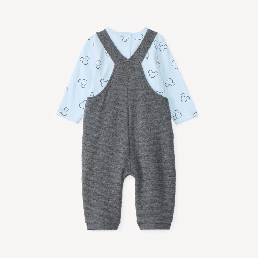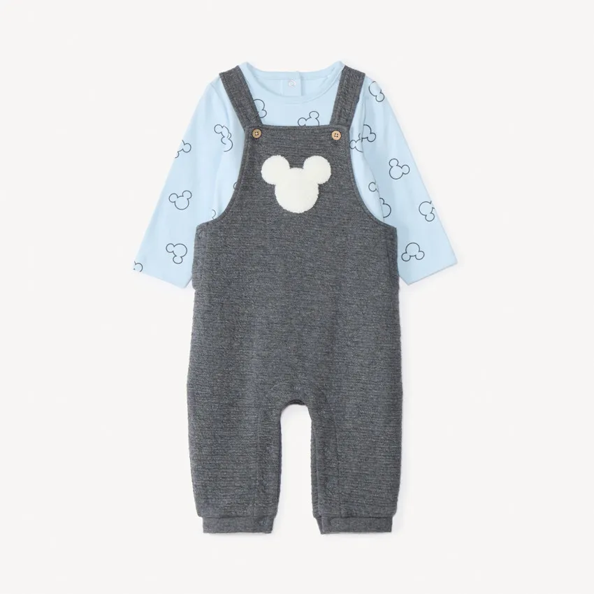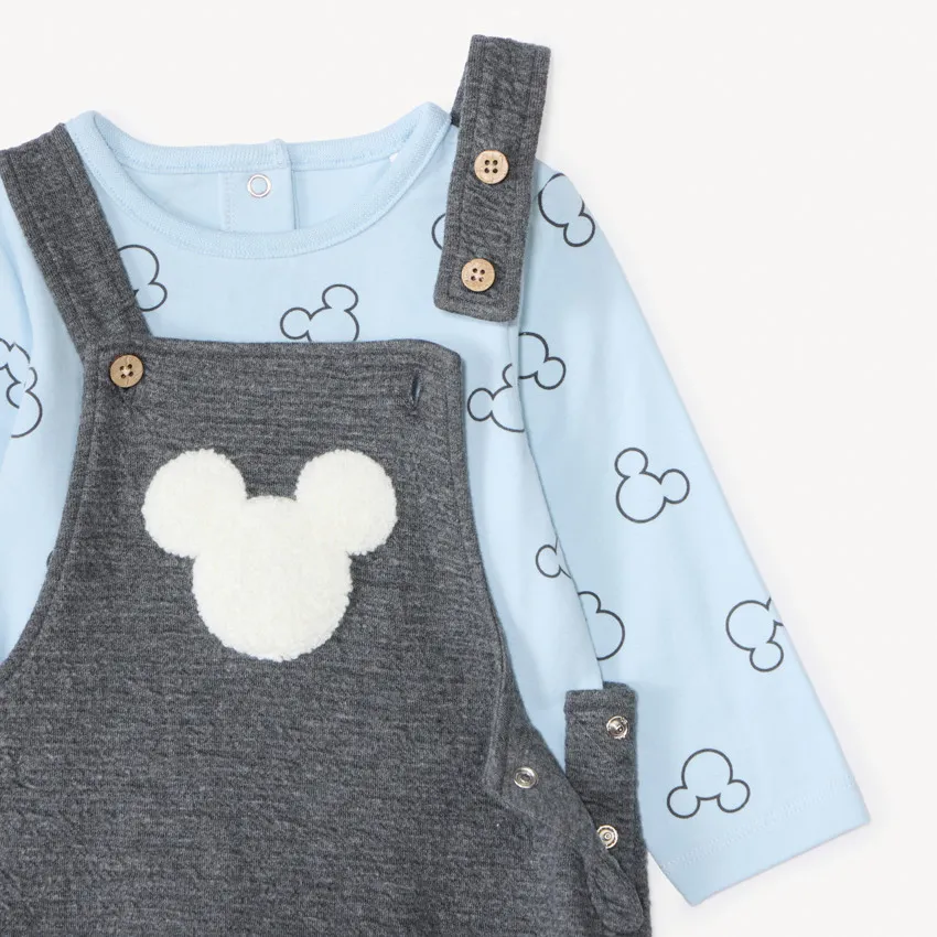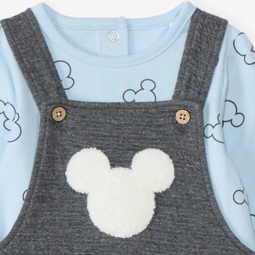 Двухпредметный комплект с рисунком «Микки Маус». Футболка с длинными рукавами из мягкого трикотажа синего цвета, спереди принт Микки по всей поверхности, круглый вырез, застёжка на кнопки на спинке.Комбинезон из стёганого трикотажа серого цвета с регулируемыми бретелями на две высоты, декоративные пуговицы, спереди контрастная аппликация Микки с эффектом 3D, спинка «борцовка», боковые и промежностные застёжки на кнопки, эластичные манжеты на щиколотках, внутренний слой из трикотажа.