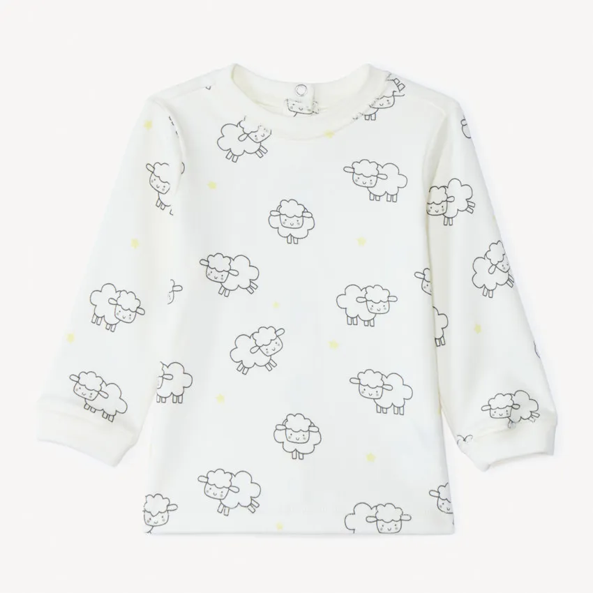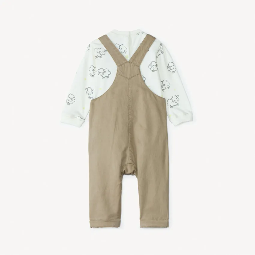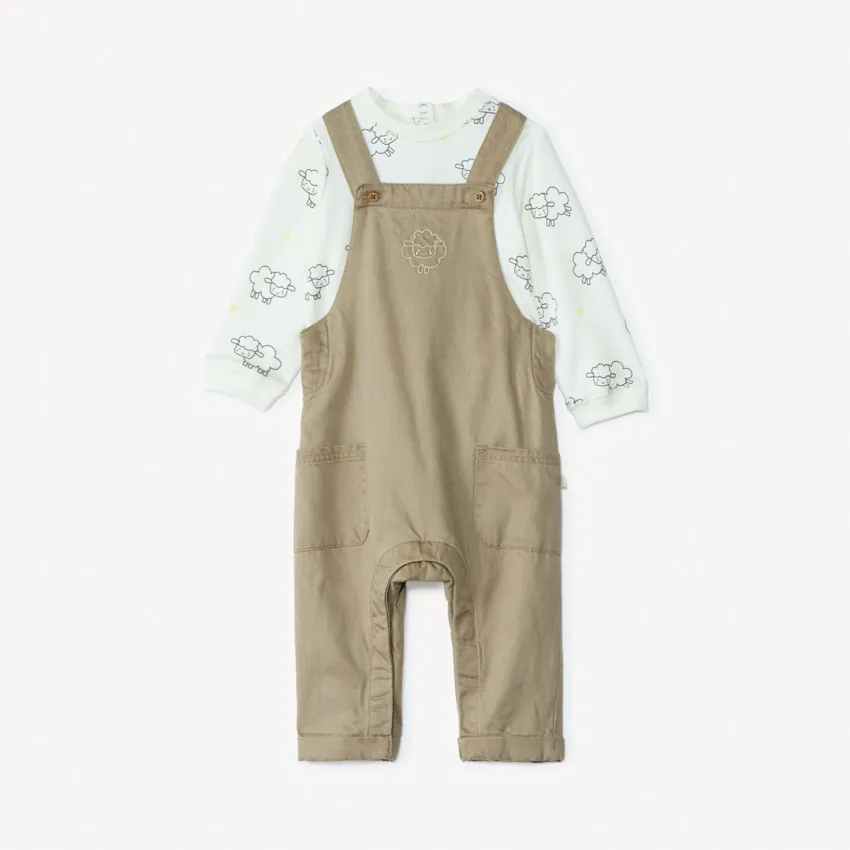 Набор из 2-х вещей — комбинезон и футболка с длинным рукавом — удобный и стильный комплект на каждый день. Лёгкий кофейно-бежевый комбинезон выполнен в лаконичном дизайне с небольшими накладными кармашками и вышивкой на груди, а регулируемые лямки позволяют комфортно настроить посадку. Футболка дополнена милым принтом с овечками, создающим нежный и тёплый образ. Мягкий материал приятен к коже малыша, а удобная застёжка на плечике облегчает переодевание. Практичный, универсальный и милый комплект — идеален для прогулок, игр и уютных повседневных образов.
