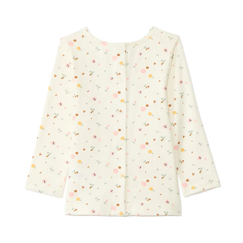 Футболка с длинными рукавами имеет застёжку сзади на спине, а рукава с оборками добавляют образу лёгкий декоративный акцент. Комплект легко сочетается с колготками и обувью для малышей и подходит для ежедневного использования.