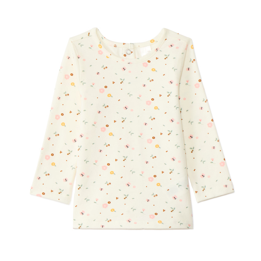Футболка с длинными рукавами имеет застёжку сзади на спине, а рукава с оборками добавляют образу лёгкий декоративный акцент. Комплект легко сочетается с колготками и обувью для малышей и подходит для ежедневного использования.