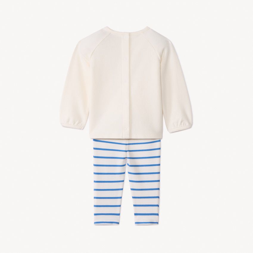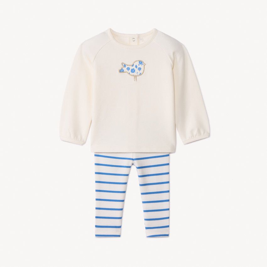 Детский комплект из мягкого флиса, состоящий из двух предметов — кофточки и леггинсов. Футболка с длинными рукавами выполнена в однотонном экрю цвете, украшена нашивкой с цветочным принтом и изображением птицы. Модель с круглым вырезом горловины и застёжкой на кнопку сзади. Рукава реглан с объёмной посадкой и эластичными манжетами. Леггинсы с контрастным полосатым узором и мягким эластичным поясом обеспечивают комфортную посадку. Идеальный комплект для дома или прогулок в прохладное время года.