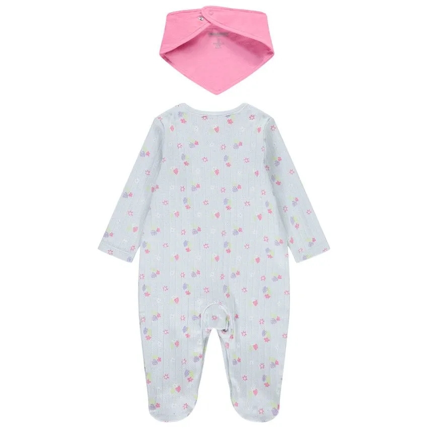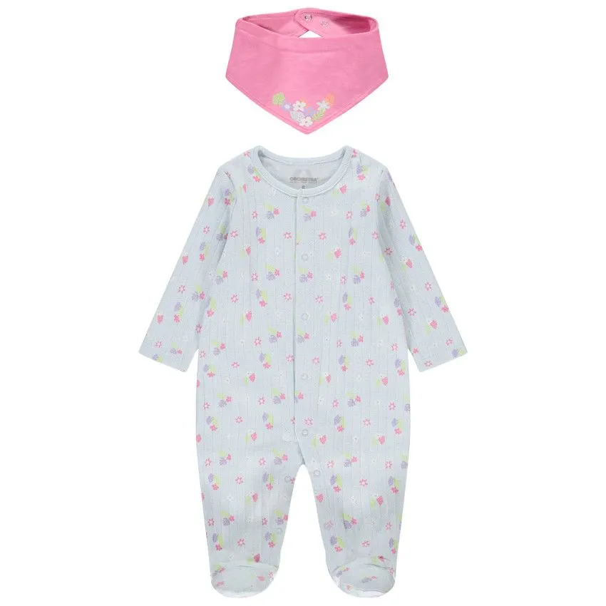 | Комплект для малышей из пижамного слипа и нагрудника-банданы. Слип выполнен из мягкого трикотажа в рубчик пастельно-голубого цвета с мелким цветочным принтом. В зависимости от возраста предусмотрены два варианта застёжки: спереди и в шаговом шве — от рождения до 6 месяцев, сзади и на переносице — от 9 до 23 месяцев. Модель с длинными рукавами и закрытыми ножками. Нагрудник-бандана из хлопкового джерси в оттенке фуксии с цветочным принтом. Застёжка на две кнопки сзади. Удобный и практичный комплект для комфортного сна и ухода за малышом. |