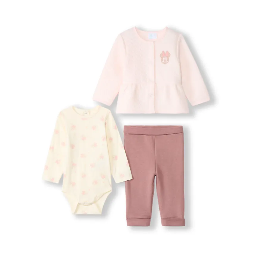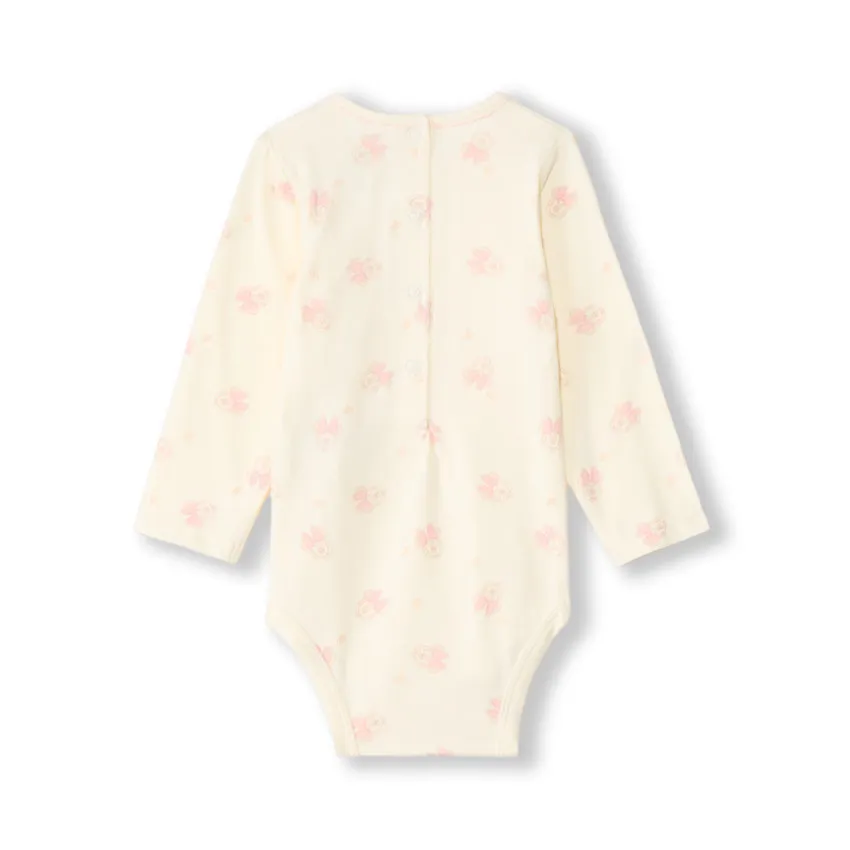 Боди из мягкого трикотажа цвета экрю с длинными рукавами, круглым вырезом и застёжками на спинке и внизу. Украшен принтом Minnie по всей поверхности.