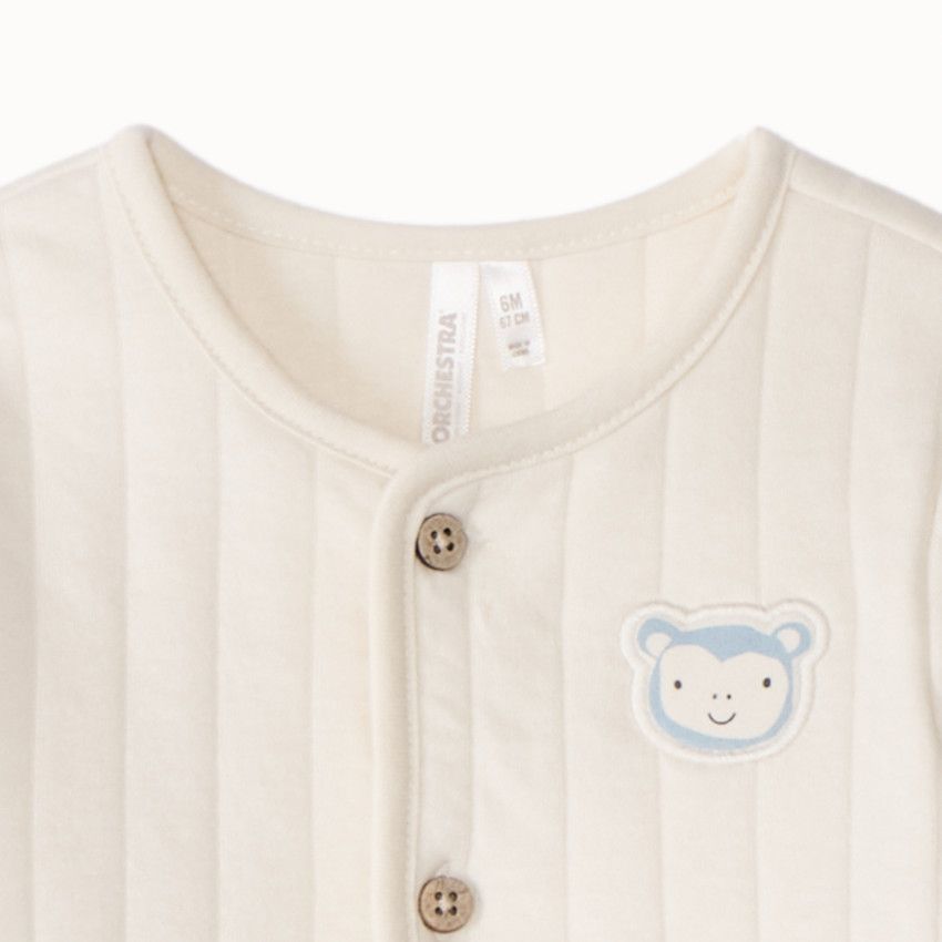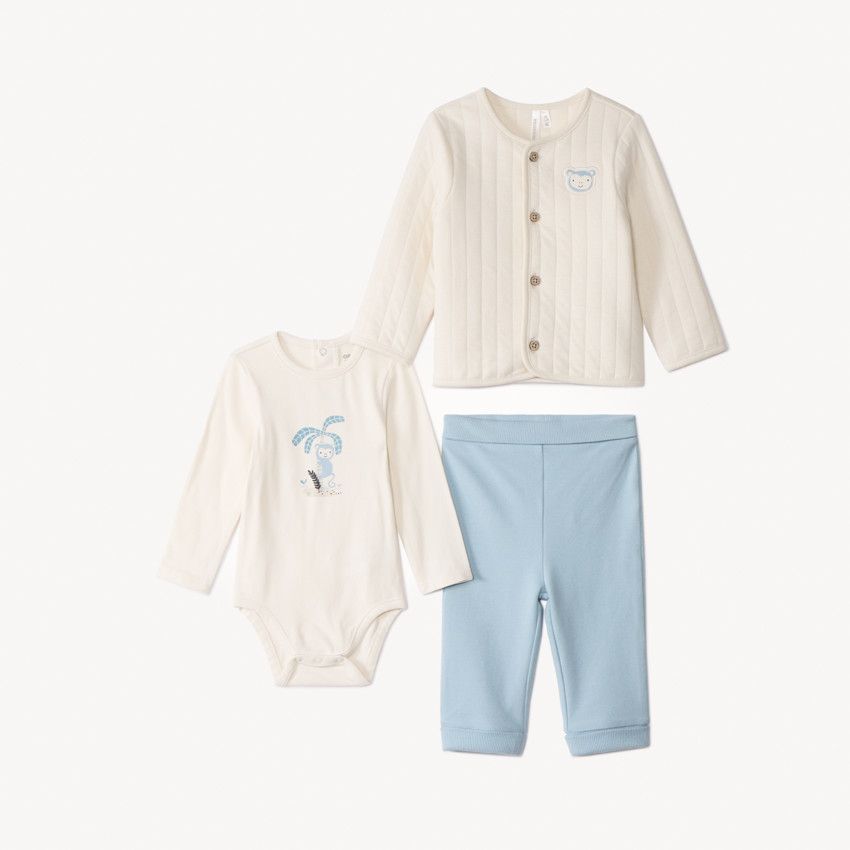 Комплект для малышей из трёх предметов: боди, кардиган и леггинсы. Боди с длинными рукавами выполнен из мягкого трикотажа экрю цвета, украшен контрастным объёмным принтом спереди. Модель с круглым вырезом, застёжкой на кнопки сзади и в области промежности для удобства переодевания. Кардиган из трикотажного полотна с лёгким стёганым эффектом, также в цвете экрю. Декорирована нашивкой с изображением обезьянки. Застёжка на пуговицы спереди, круглый вырез и однотонная спинка. Леггинсы из мягкого флиса небесно-голубого цвета с эластичным поясом и рубашечной застёжкой, дополнены ребристыми манжетами по низу. Удобный и тёплый комплект для повседневной носки.