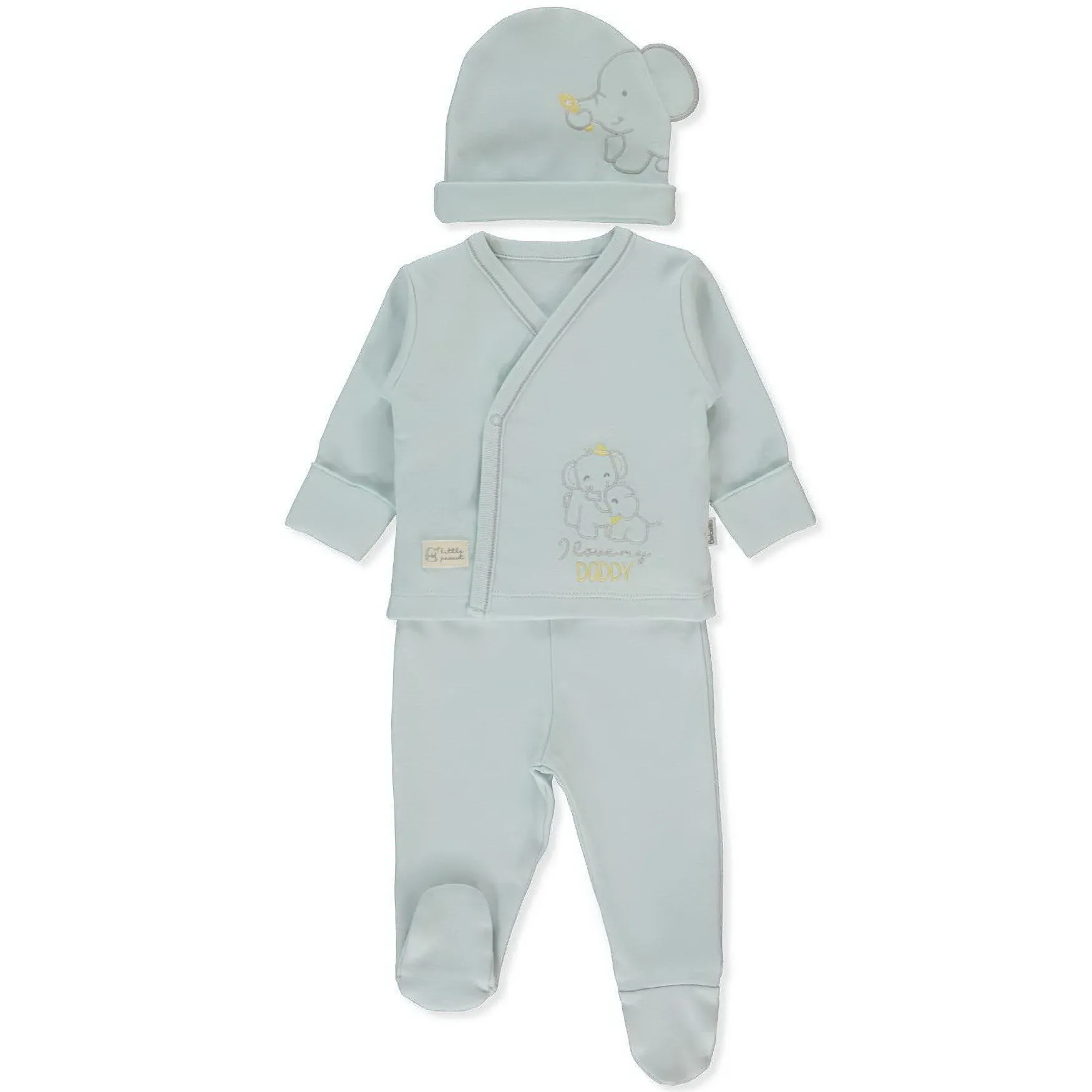 Нежный комплект из 3-х предметов для новорождённых: распашонка с открытыми рукавами с милым принтом слоника с мамой, ползунки с закрытыми ножками и мягкая шапочка с изображением слоника. Изготовлен из приятного к телу хлопка — идеально для первых дней малыша.