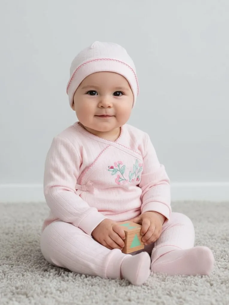 Распашонка с длинными рукавами дополнена аккуратной завязкой-бантом, что делает модель удобной и милой. Ползунки оснащены манжетами на щиколотках из эластичной сетки, которые обеспечивают хорошую фиксацию и свободу движений.