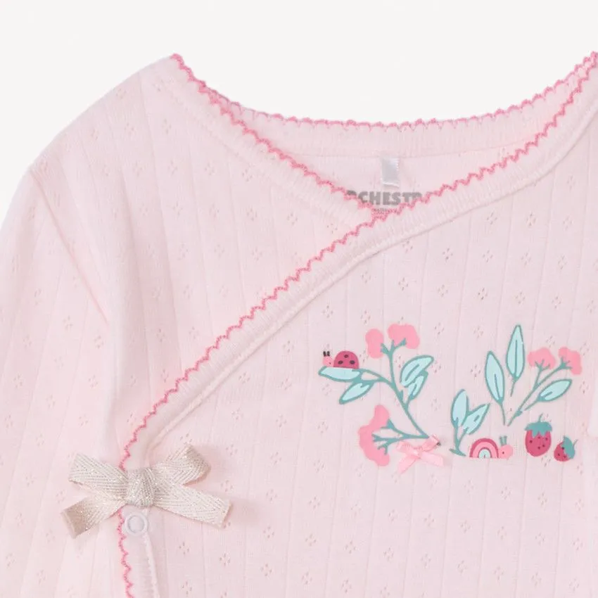 Распашонка с длинными рукавами дополнена аккуратной завязкой-бантом, что делает модель удобной и милой. Ползунки оснащены манжетами на щиколотках из эластичной сетки, которые обеспечивают хорошую фиксацию и свободу движений.