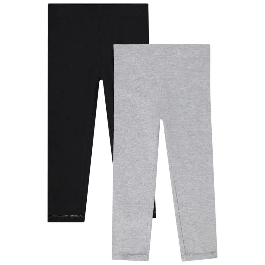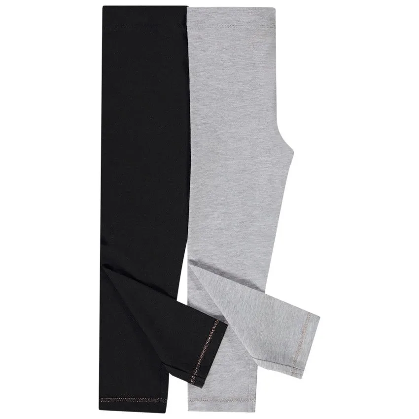 Комплект из двух длинных трикотажных леггинсов для девочек. Однотонные, с мягким эластичным поясом. Низ украшен декоративными золотистыми швами с блестящей отделкой. Удобный и практичный вариант на каждый день.