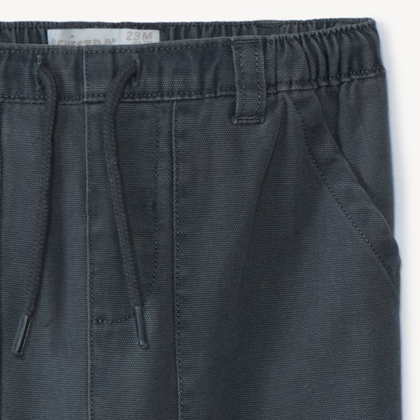 Малышковые брюки из плотной однотонной ткани — удобная модель для повседневной носки. Эластичный пояс со шнурком, шлевки для ремня и имитация гульфика создают аккуратный образ. Спереди — накладные карманы, низ штанин с мягкими подворотами. Подходят для прогулок и активных игр.