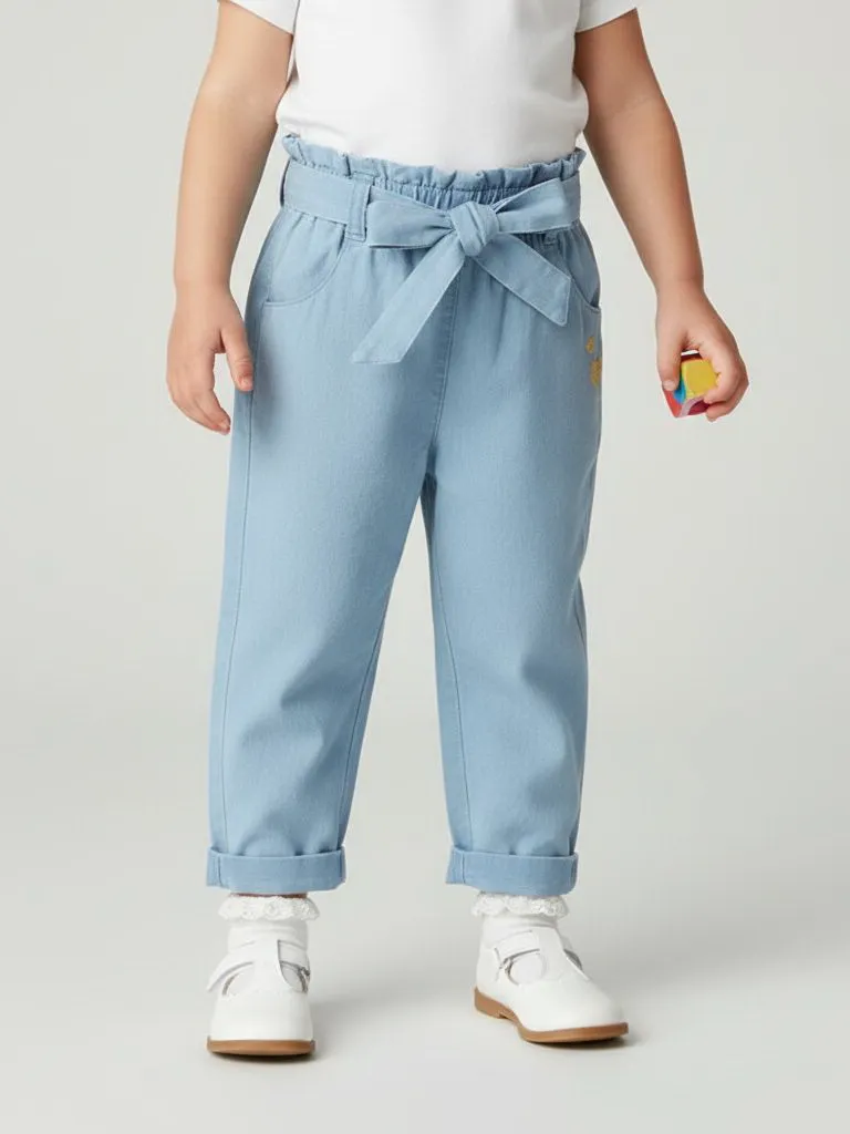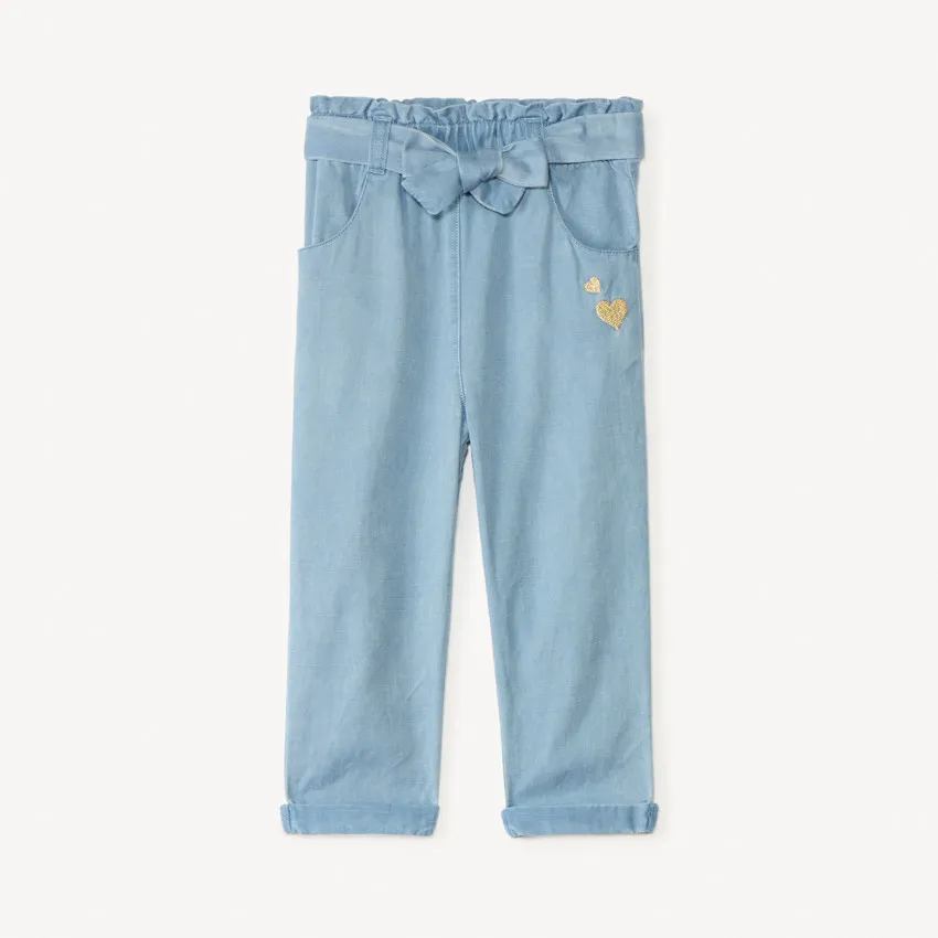 Модель имеет эластичный пояс с декоративной оборкой и шлёвки для ремня, благодаря чему брюки хорошо сидят по фигуре. Спереди расположены два удобных кармана, а под левым карманом выполнена нежная вышивка в виде золотистых сердечек, которая придаёт модели особый шарм. Аккуратные подвороты внизу брюк завершают стильный и аккуратный образ.