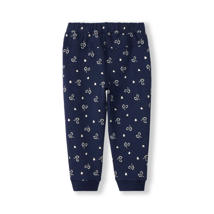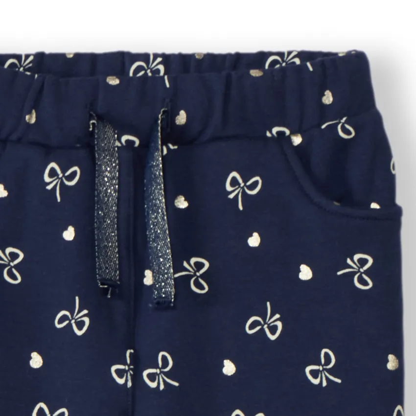 Темно-синий цвет дополнен принтом по всей поверхности с золотистыми бантами и сердечками, что создаёт нарядный и игривый вид.
