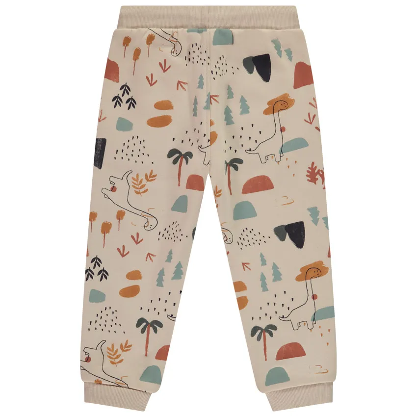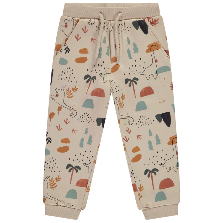 Спортивные брюки-джоггеры из мягкого начёсного футера в бежевом цвете с забавным принтом динозавров по всей поверхности. Модель имеет удобную эластичную талию с рибаной и шнурком в тон, а также декоративную тесьму спереди. Спереди расположены два итальянских кармана. Низ брючин выполнен на эластичных манжетах для комфортной посадки. Отличный выбор для повседневных прогулок и активных игр.