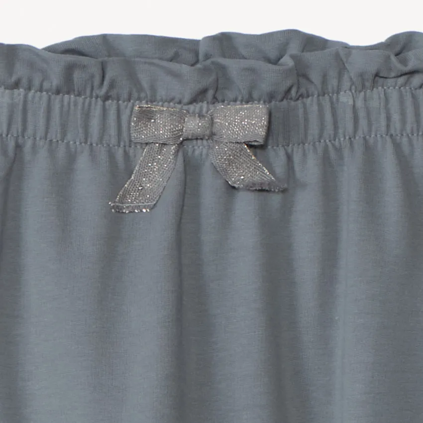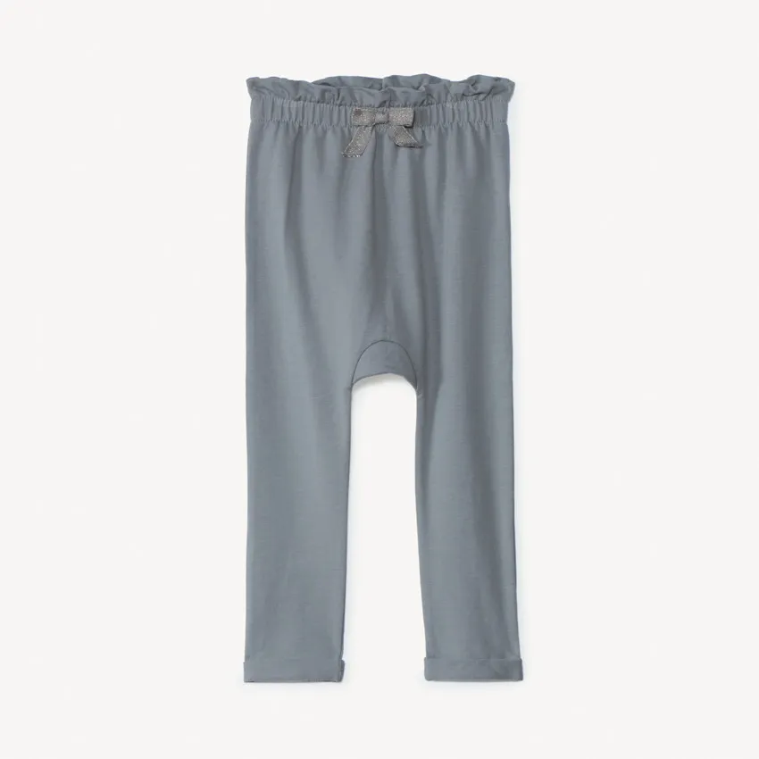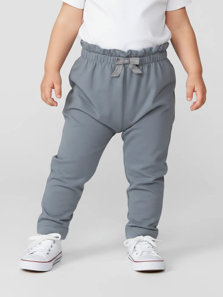 Трикотажные брюки из мягкого футера для малышки. Модель с ластовицей, увеличенным объёмом под подгузник и высокой посадкой. Эластичный пояс с нежной оборкой дополнен декоративным бантом. Фиксированные отвороты на лодыжках аккуратно оформляют низ и не мешают малышам ползать.