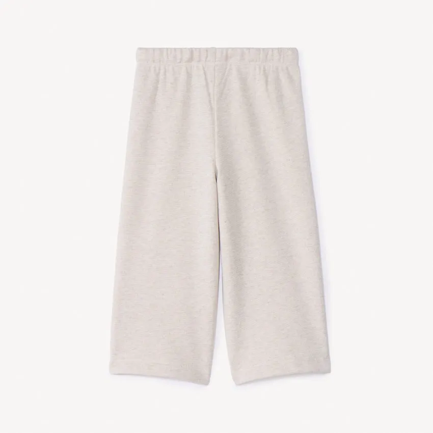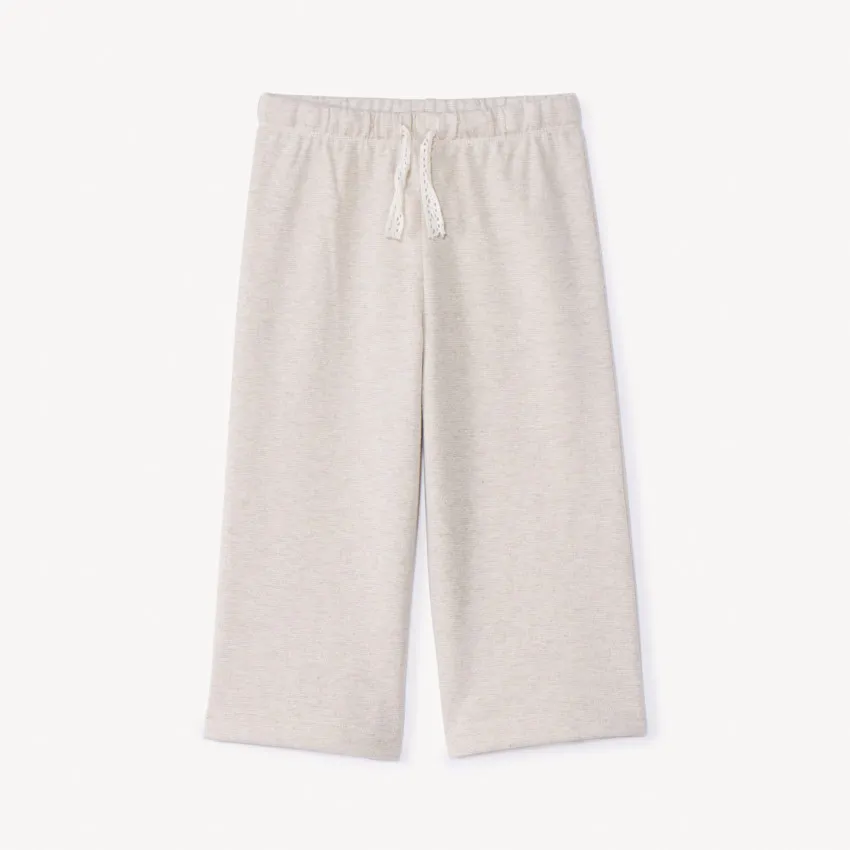 Широкие трикотажные брюки из флиса с высокой посадкой для малышки. Эластичный пояс со шнурком из кружева удобно регулируется. Модель украшена тонким люрексом, придающим лёгкое сияние. Свободный крой не сковывает движений и обеспечивает комфорт.