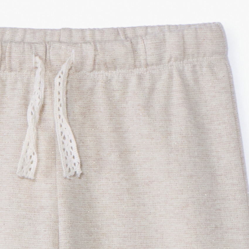 Широкие трикотажные брюки из флиса с высокой посадкой для малышки. Эластичный пояс со шнурком из кружева удобно регулируется. Модель украшена тонким люрексом, придающим лёгкое сияние. Свободный крой не сковывает движений и обеспечивает комфорт.