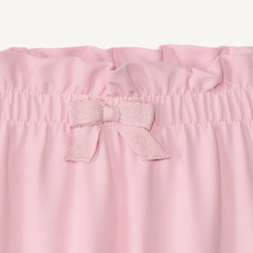 Модель выполнена из приятной на ощупь ткани с высоким содержанием хлопка (95%) и добавлением эластана (5%) для свободы движений и удобной посадки. Очаровательный декоративный бант спереди с нитью золотого люрекса добавляет нарядный акцент и делает образ ещё милее.