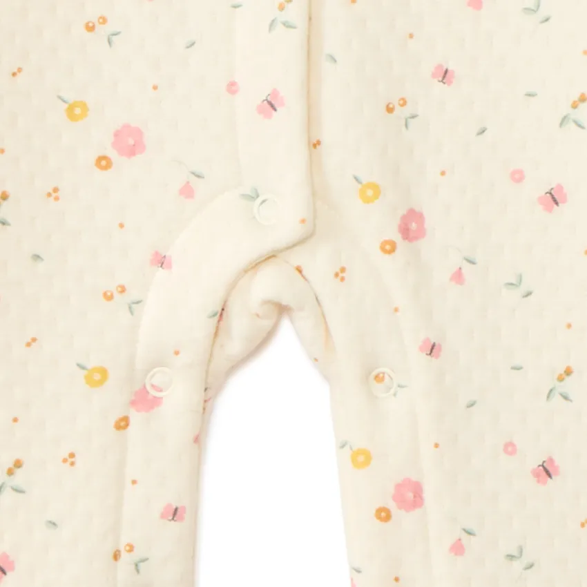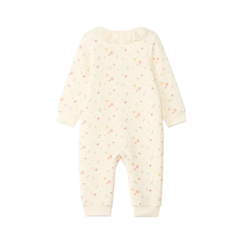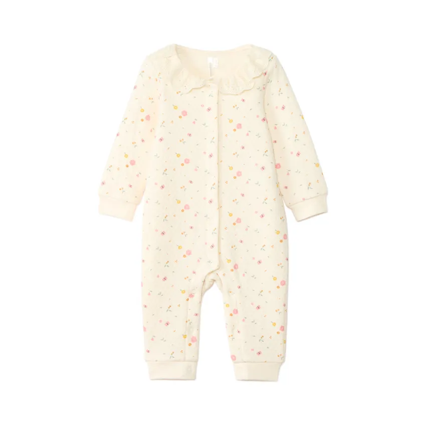 Нежный комбинезон для малышки, созданный для самых тёплых и уютных моментов. Молочный оттенок ткани украшен мелким цветочным принтом в пастельных тонах, что придаёт образу особую лёгкость и натуральную нежность. Воздушный воротничок с воланами добавляет изысканный акцент и превращает повседневную модель в по-настоящему очаровательный наряд. Мягкий материал приятен к коже ребёнка и обеспечивает комфорт в течение всего дня, а удобная застёжка по всей длине облегчает переодевание. Этот комбинезон станет идеальным выбором для сна, прогулок и первых уютных дней малышки — нежный, тёплый и созданный для заботы.
