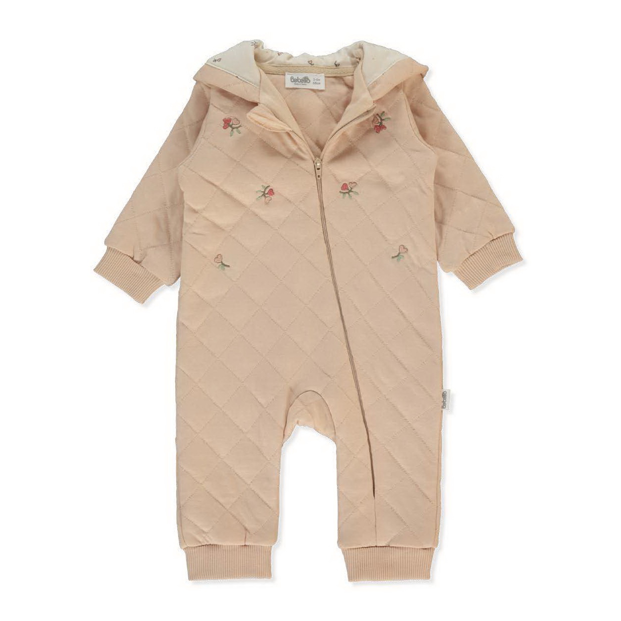 Комбинезон с капюшоном, идеально подходящий для прохладной погоды. Верхняя часть украшена милыми вышивками, добавляющими образу нежности и уюта. Капюшон обеспечивает дополнительное тепло и защиту от ветра. Комбинезон выполнен из мягкого, приятного к телу материала, обеспечивая комфорт малышу в течение всего дня.