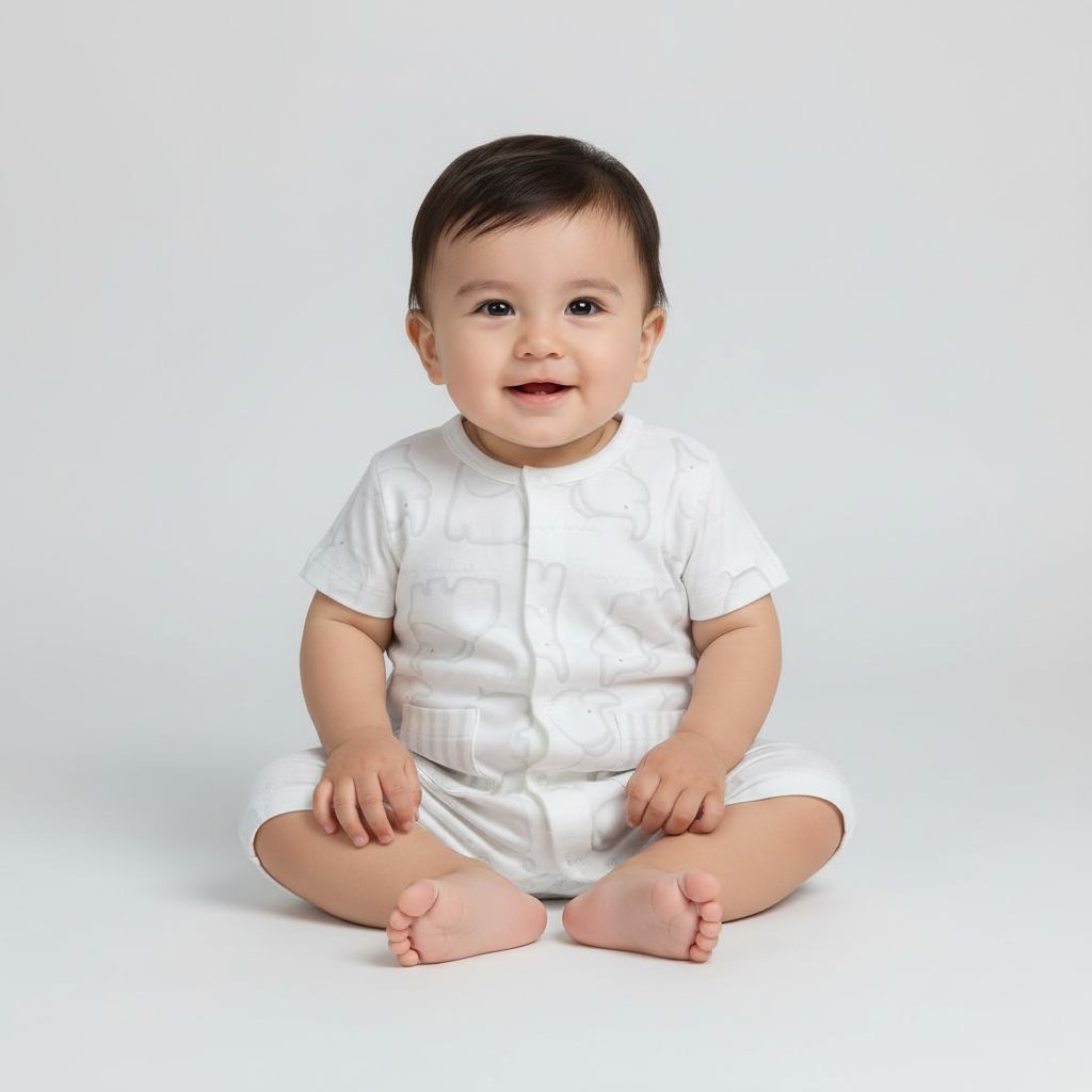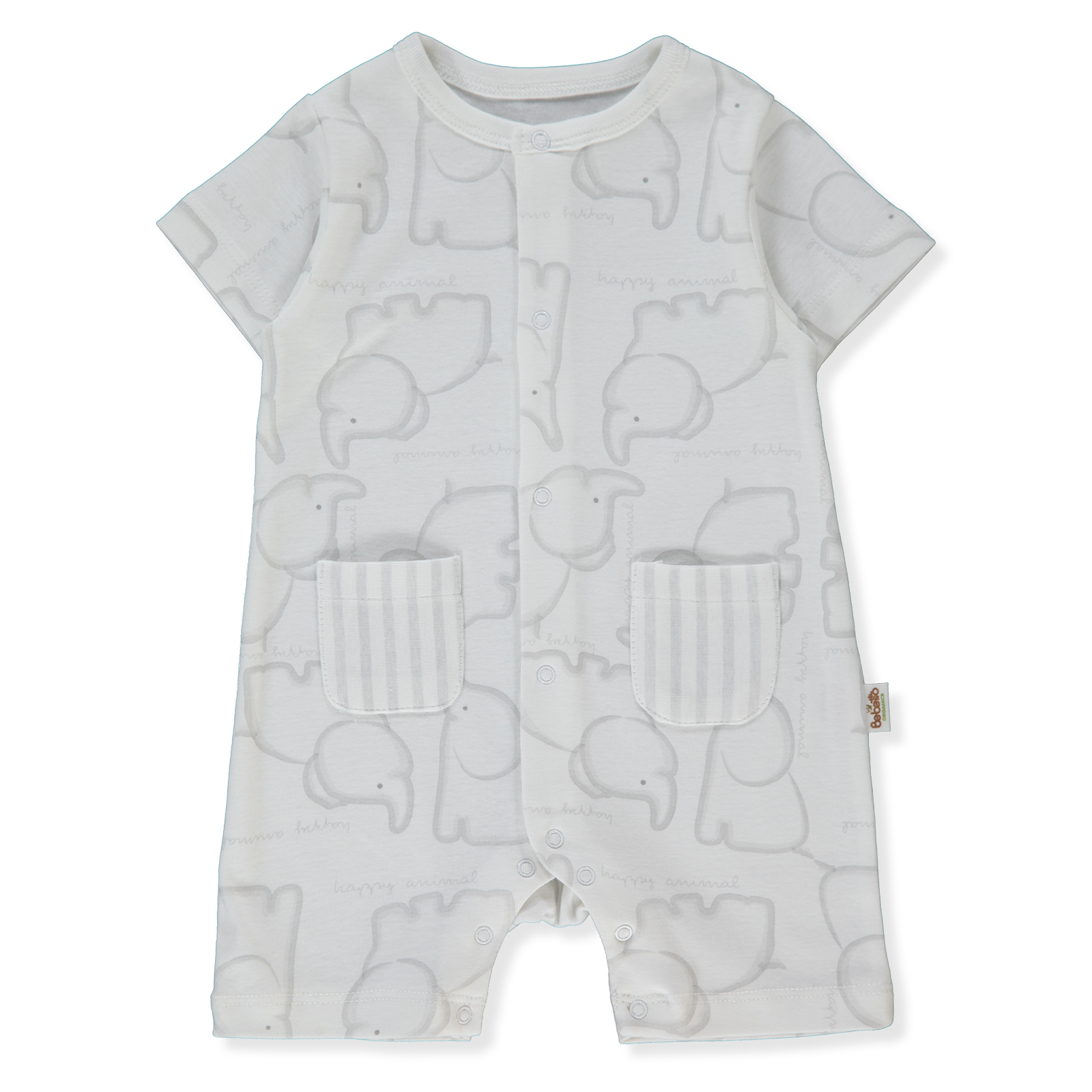 Короткие рукава и штанишки обеспечивают комфорт в тёплые дни. Удобная застёжка на кнопки по всей длине облегчает переодевание и смену подгузника, а аккуратные кармашки добавляют милый акцент.