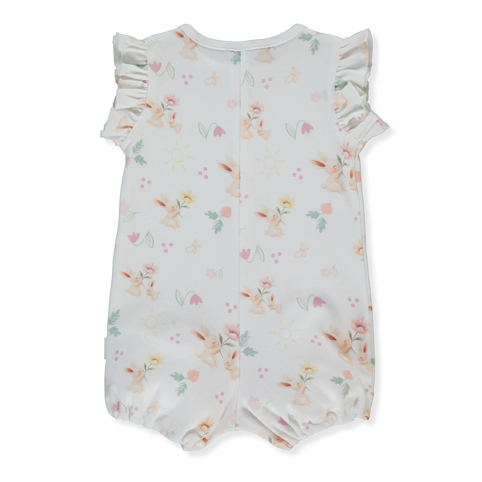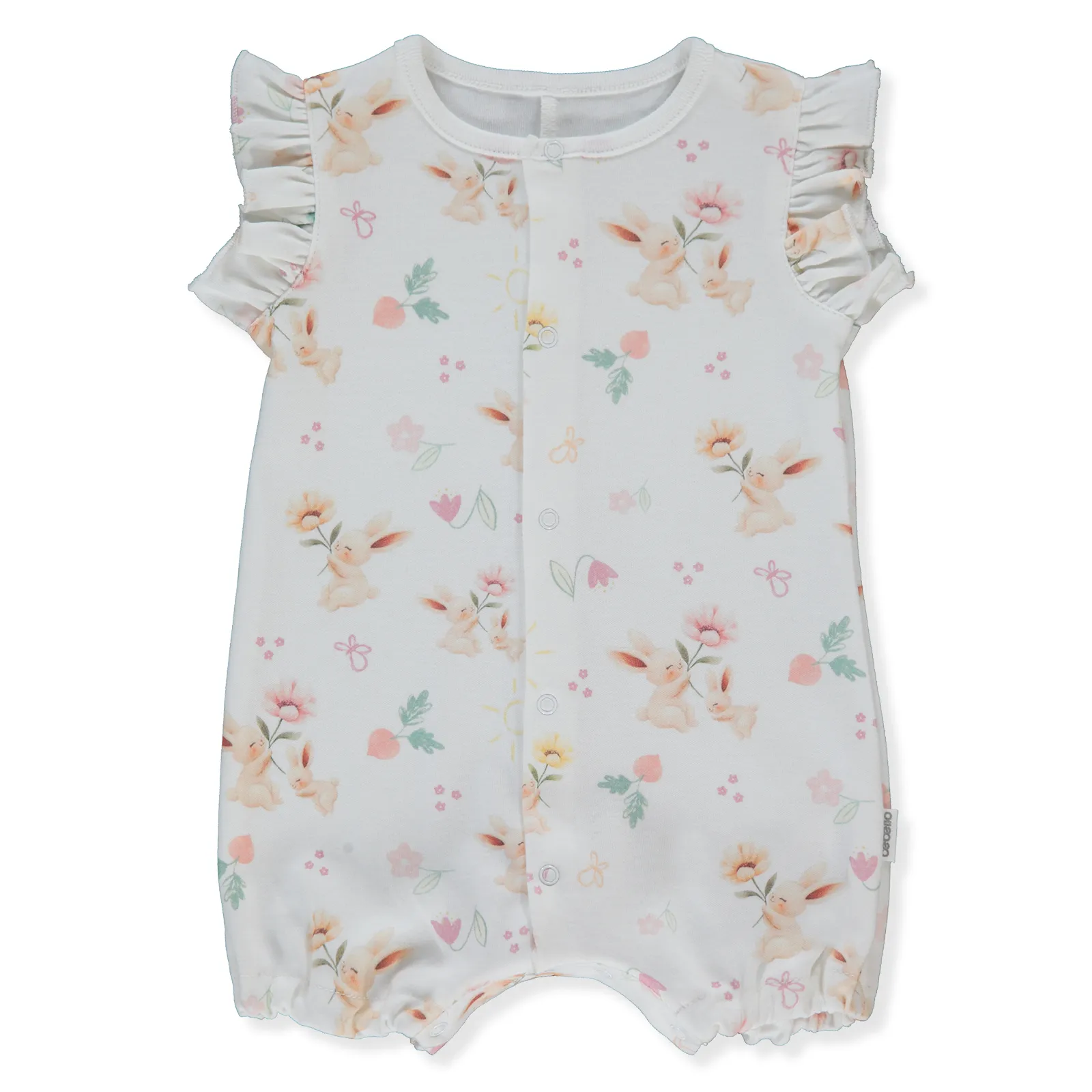 Короткие рукава с аккуратными рюшами добавляют нежный акцент, а застёжка на кнопки по всей длине облегчает переодевание и смену подгузника. Нежный цветочный принт делает образ аккуратным и милым.